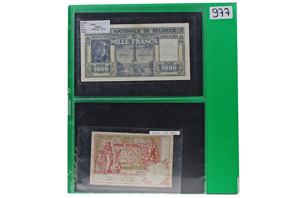 Groen album met ca. 60 stuks Belgische bankbiljetten. Ook betere! Fraai en beter.