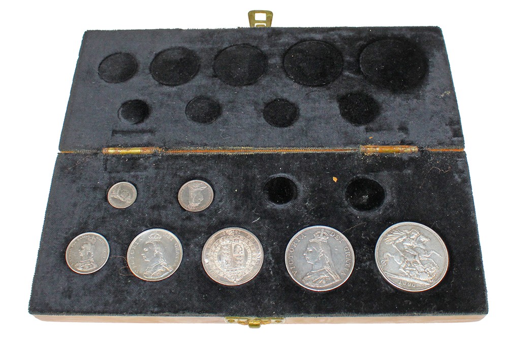 Houten cassette, van binnen met zwart fluweel bekleed, met 7 munten van Victoria: 3 pence en 6 pence, shilling, florin, halfcrown, double florin & crown 1887-1890. VF – UNC.