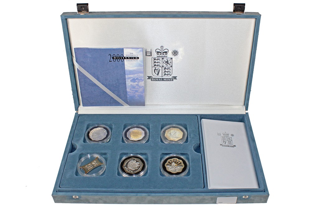 Fraaie lichtblauwe cassette British Royal Mint “The Masterpiece 2000 Millennium Collection” met 24 zilveren munten diverse landen; sommige met een ongebruikelijke vorm. Info bijgesloten.