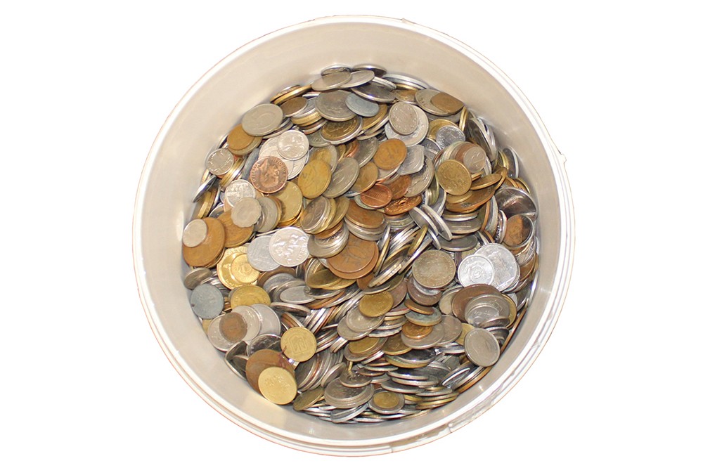 Plastic emmer met ca. 12 kg. eenvoudige wereldmunten, kilowaar.