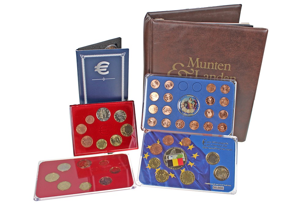 Doos met luxe eurosetjes van verschillende landen. Nominaal ruim €120. Toegevoegd: Het Waterloo Vijfje, 0,5 OZ AR, €5 gedenkmunt Duitsland en een albumpje eenvoudige wereldmunten.