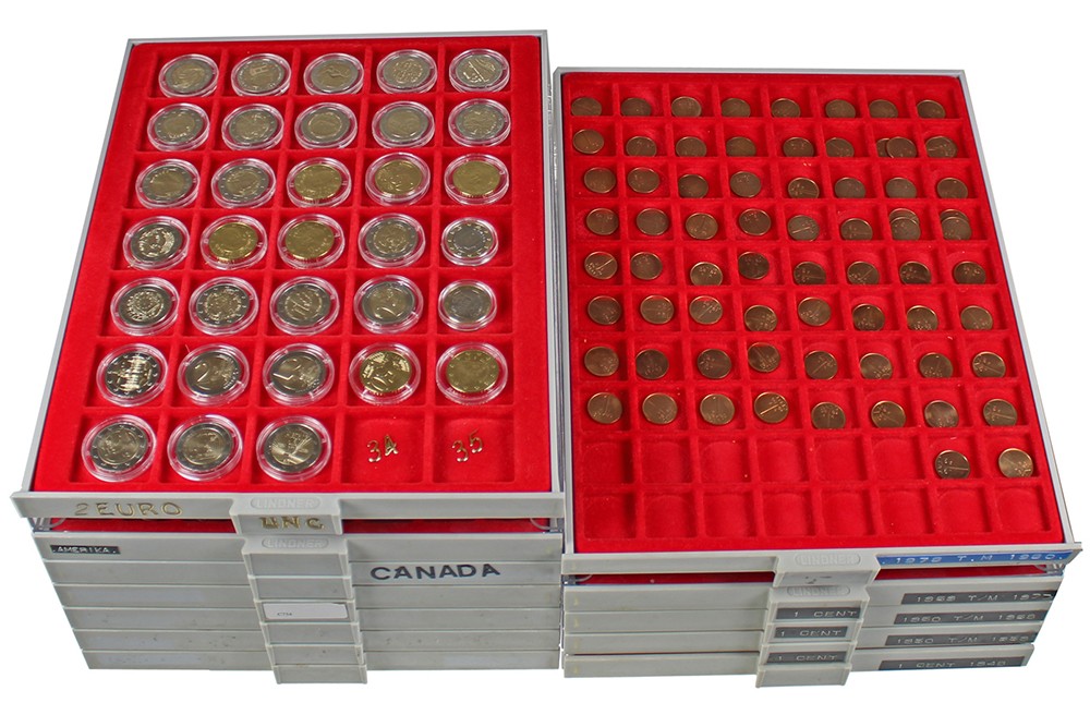 12 Lindnertableaus met modern buitenland, o.a. Canada en USA. Waaronder ook enig modern Nederland (koersgeld uit guldenperiode). Circa €50 aan gangbare valuta.