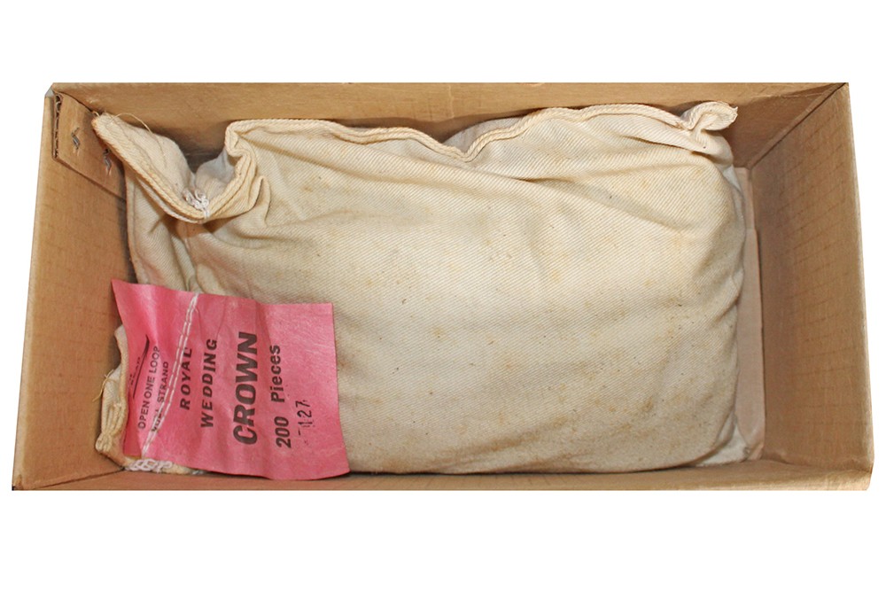 Engeland. Originele linnen zak (5,5 kg.) met 200 x Royal Wedding Crown 1981 (KM 925) in UNC.
