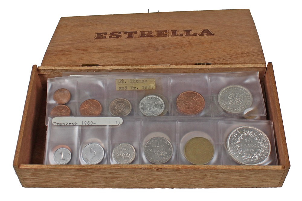 Sigarenkistje met in huisvlijt vervaardigde landenstrips (21). Ook zilver.