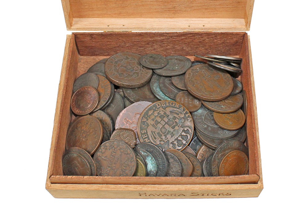 Kistje met oud koperwerk 17e – 20e eeuw, diverse landen.