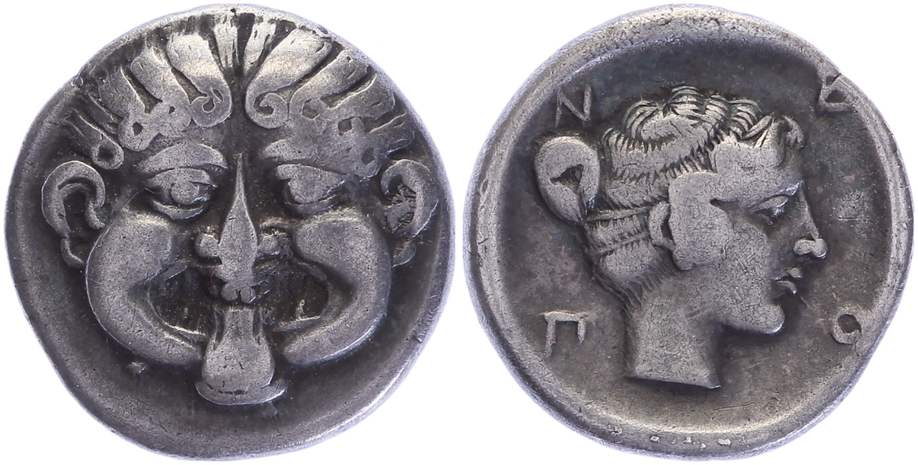Circa 424-350 BC. AR Hemidrachm (1.83 gm, 13mm). Facing gorgoneion with protruding tongue / N-E-O-Π female head right. SNG ANS 451; SNG Berry 41; Dewing 1067. attractive toning VF. Schulman Auc. 1973, lot 1145.