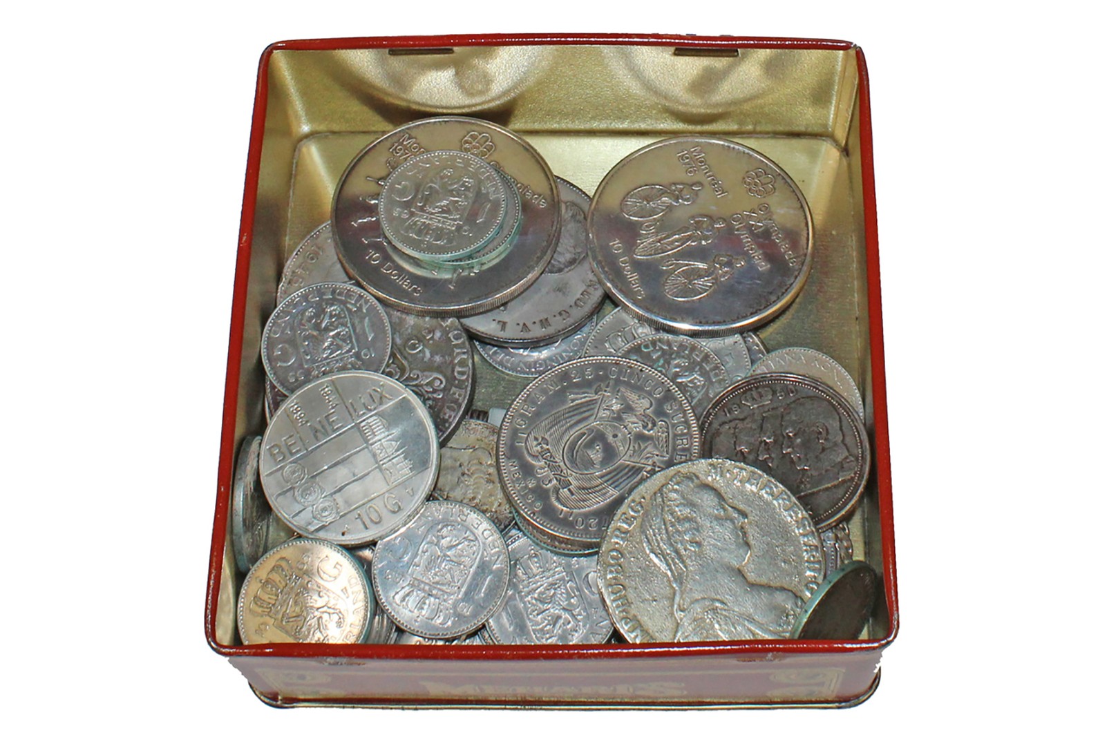 Blikje met zilveren munten wereld, ook iets Nederland. Onuitgezocht!