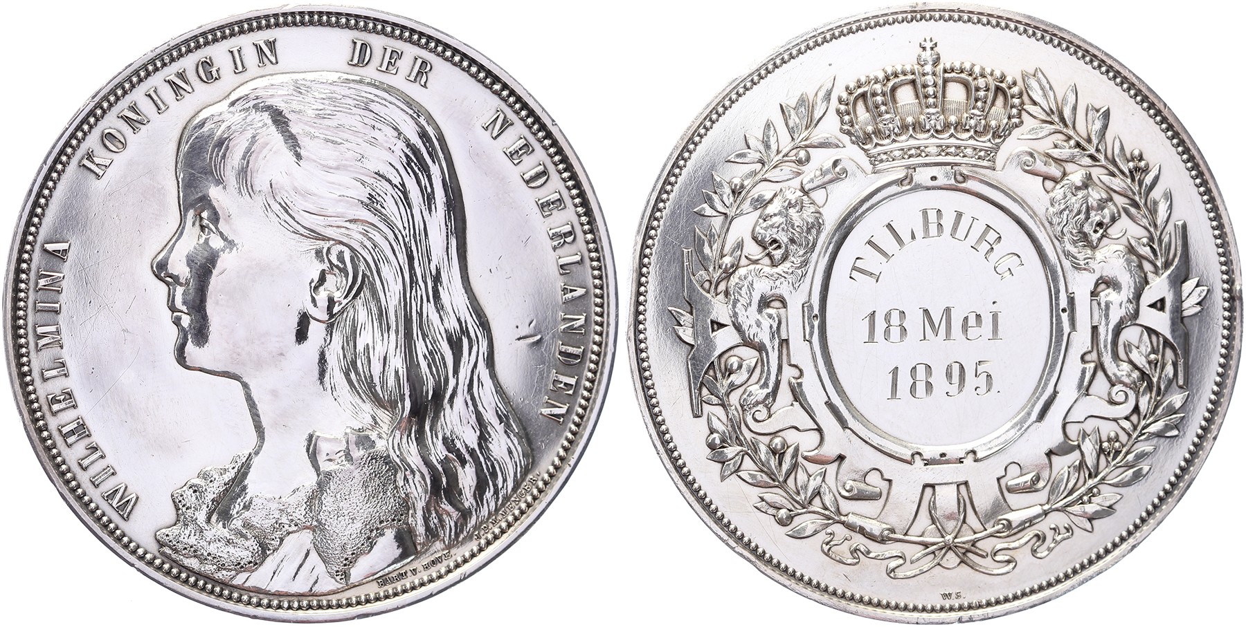 1895 Prijs/erepenning koningin Wilhelmina. Borstbeeld jonge Wilhelmina met loshangend haar naar links. / Inscriptieruimte in ovaal gehouden door twee leeuwen. Op naam gesteld.AR 66. Zw. 977. B. van Hove, J.P.M. Menger & W. Schammer. Gepoetst en 4 dichtgemaakte gaatjes in de rand; niet moeders mooiste maar wel bruto 116,8 gram èn in palmhouten doosje!