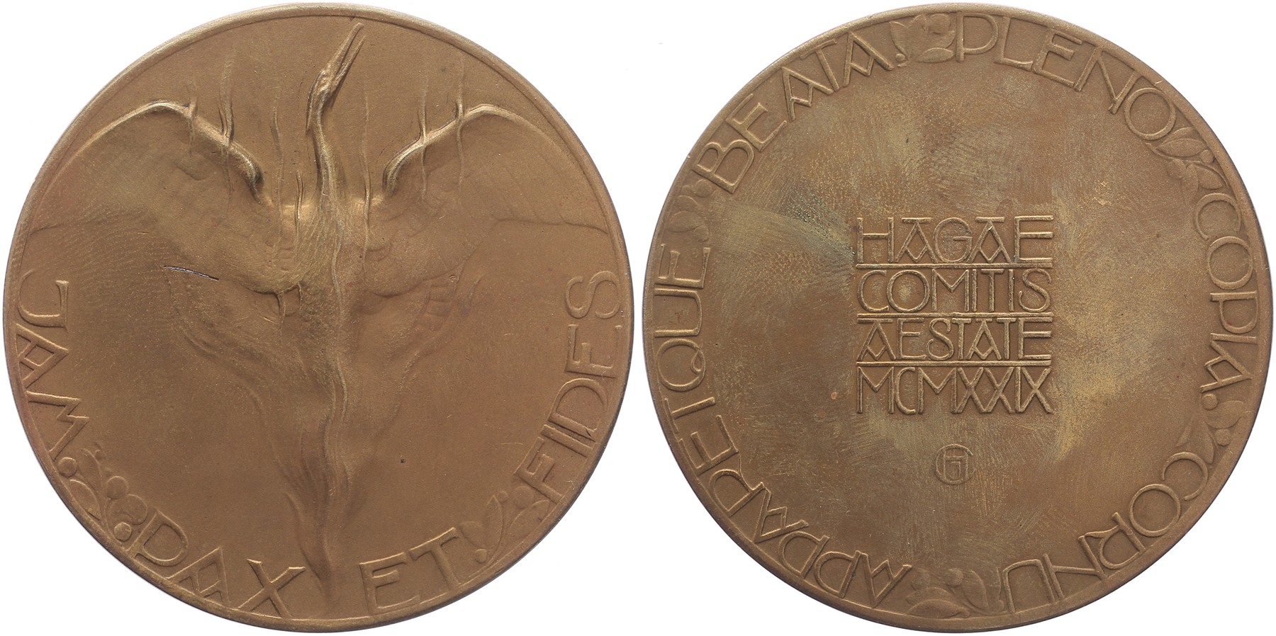 1929 Den Haag, herstelconferentie. Uit vuur oprijzende Phoenix. / Latijnse teksen.Æ 60. KB III-326; JP 211. C.J. van der Hoef. In origineel doosje PTT. Veegje kz. Prachtig.