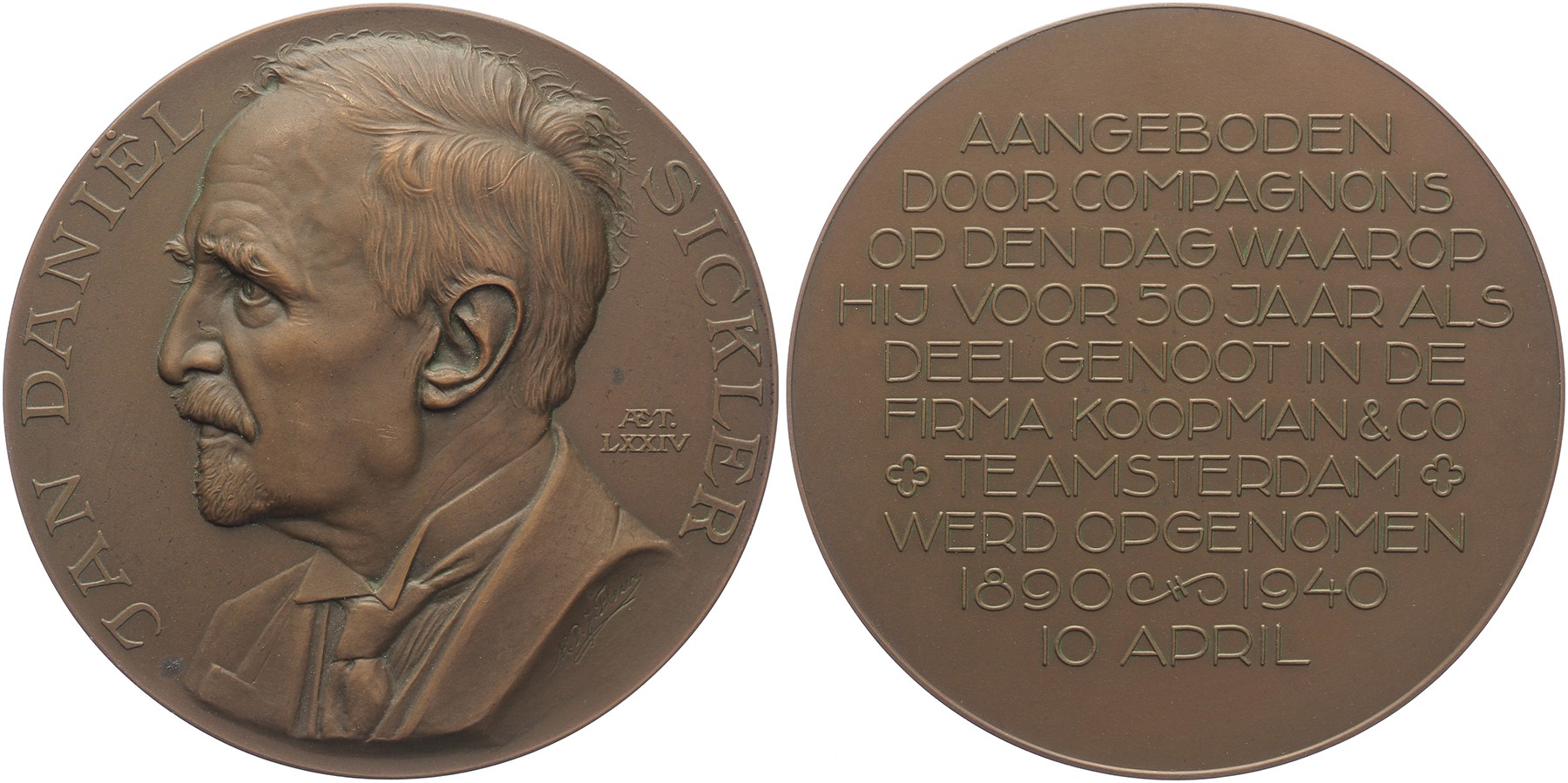 1940 Amsterdam. Jan Daniël Sickler 50 jaar verbonden aan de firma Koopman & Co. Borstbeeld naar links. / Tienregelig opschrift. Æ 70,5. KB V-1396. M.P.J. Fleur. Twee min. vlekjes kz. Prachtig.