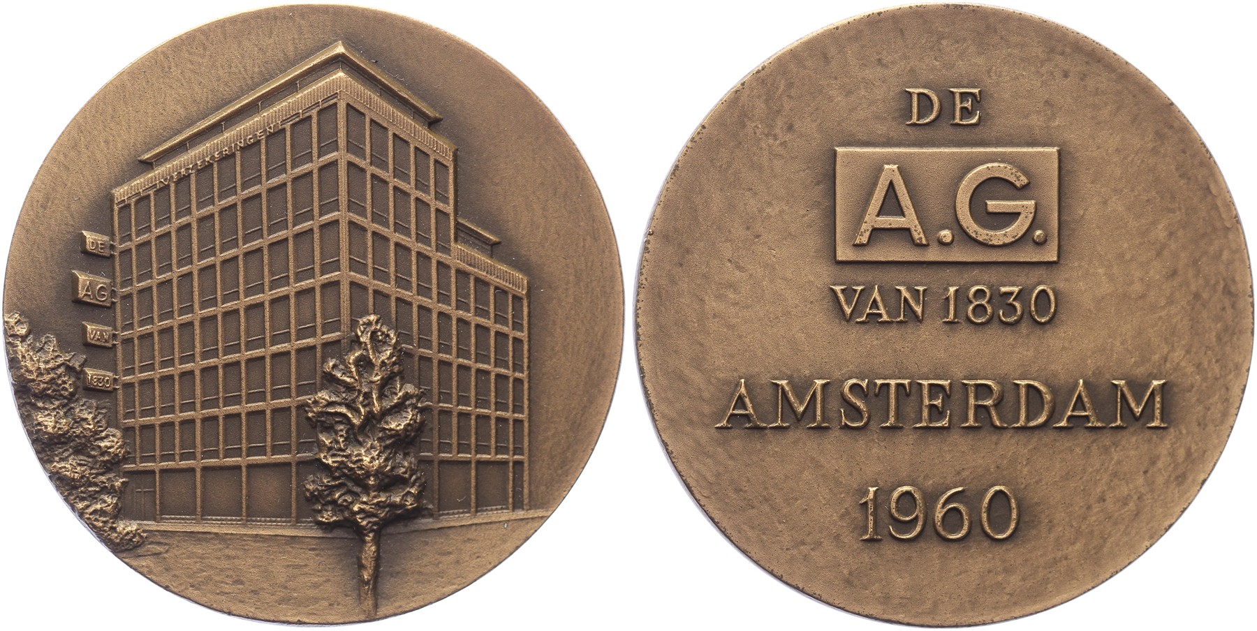 1960 Amsterdam, opening nieuw kantoor Verzekeringsmij. A.G. van 1830. Gezicht op het kantoor. / Vijfregelig opschrift. Æ 50,6. KB VI-2560. (Han Wetselaar). In orig. Cassette Begeer. Prachtig.