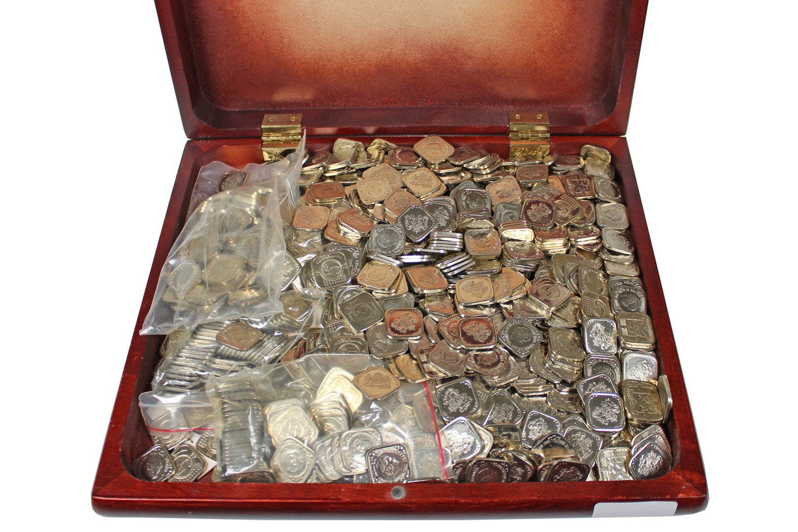 Kistje met ruim 6 kilo herdenkingsstuivers kopernikkel rond en vierkant uitgegeven door diverse Nederlandse banken in de jaren ‘70 en begin jaren ’80. Toen het nikkel nog goedkoop was…