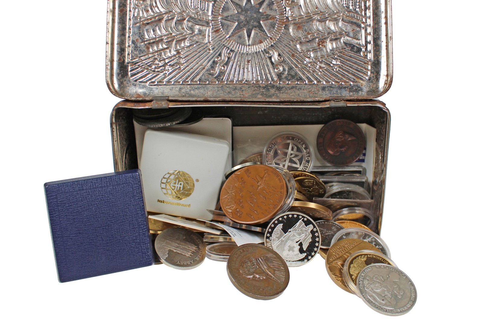 Roestig blik met diverse binnen- en buitenlandse penningen. Bijna geen zilver.