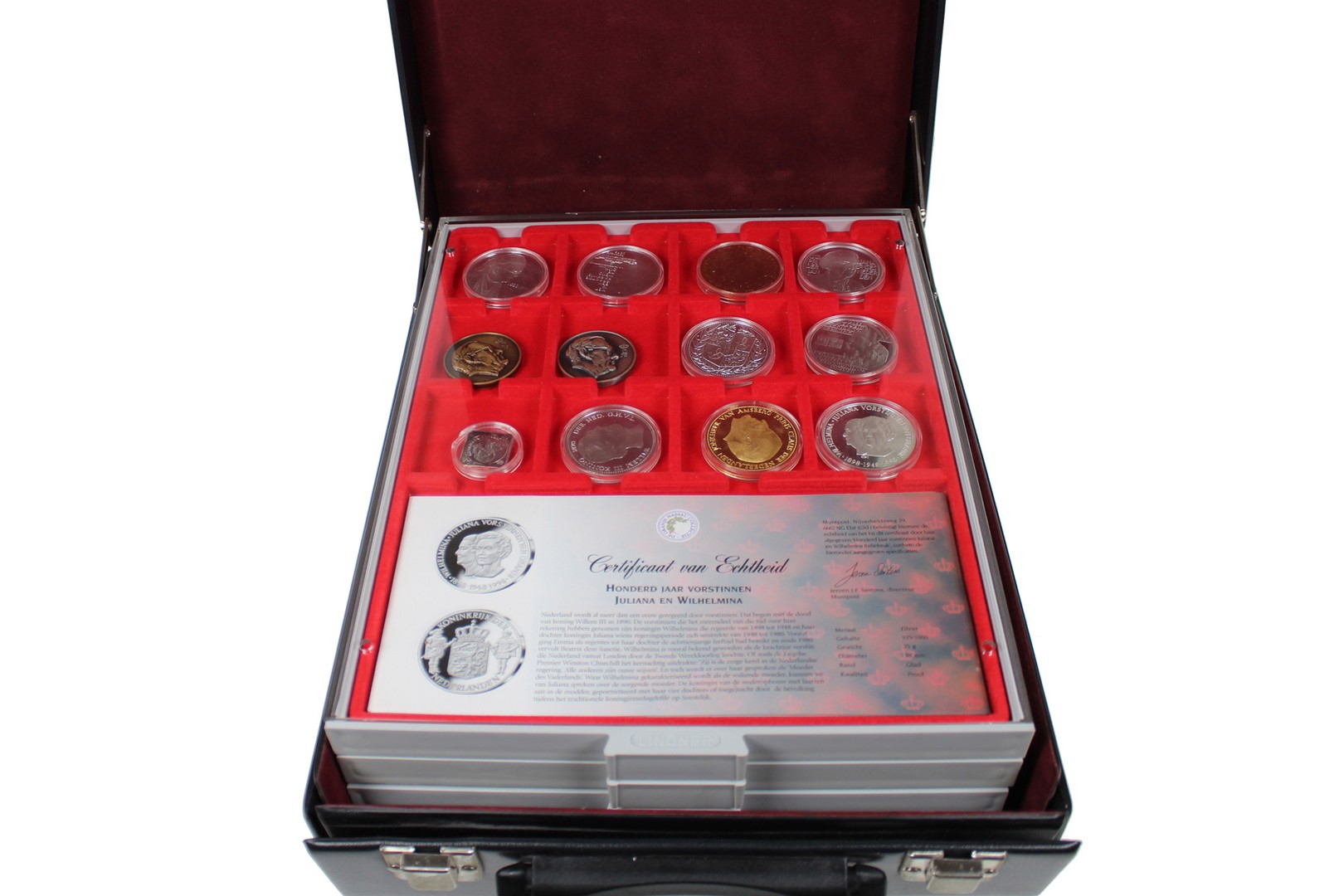 Zwart imitatielederen koffertje met 4 Lindnertableaux waarin 37 penningen, uitgegeven door Muntpost, Elst. Incl. certificaten. 20 stuks van zilver. Netto zilver: 477 gram.