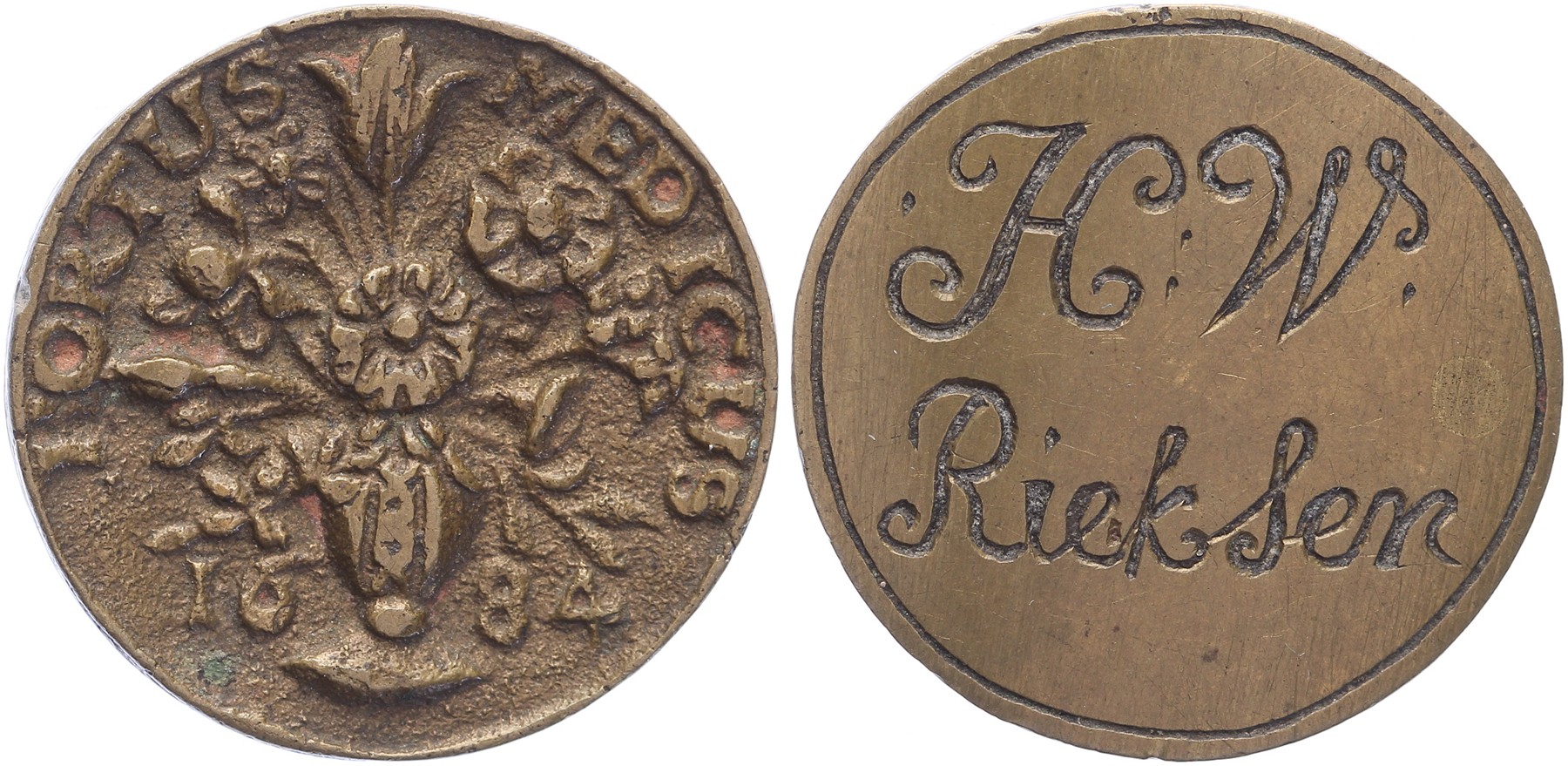 1684. Collegium Medicum. Toegangspenning voor leerling. O.n.v. H.W. Rieksen. Messing 29,5. WK 30.5. Zeer fraai.