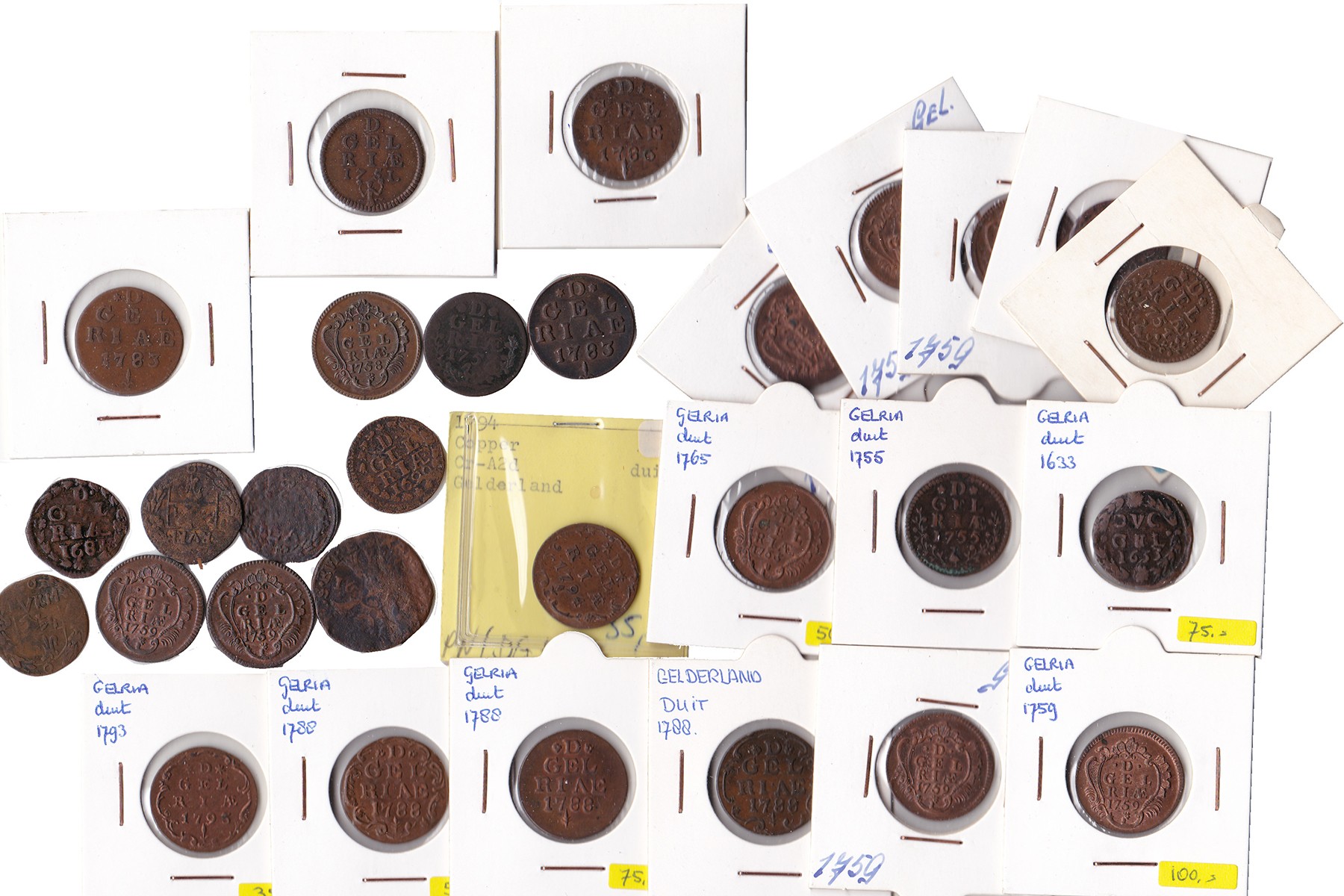 Blikje met ca. 30 duiten, oorden en statenduiten van voornamelijk Gelderland. Verschillende kwaliteiten. Ook mooi!