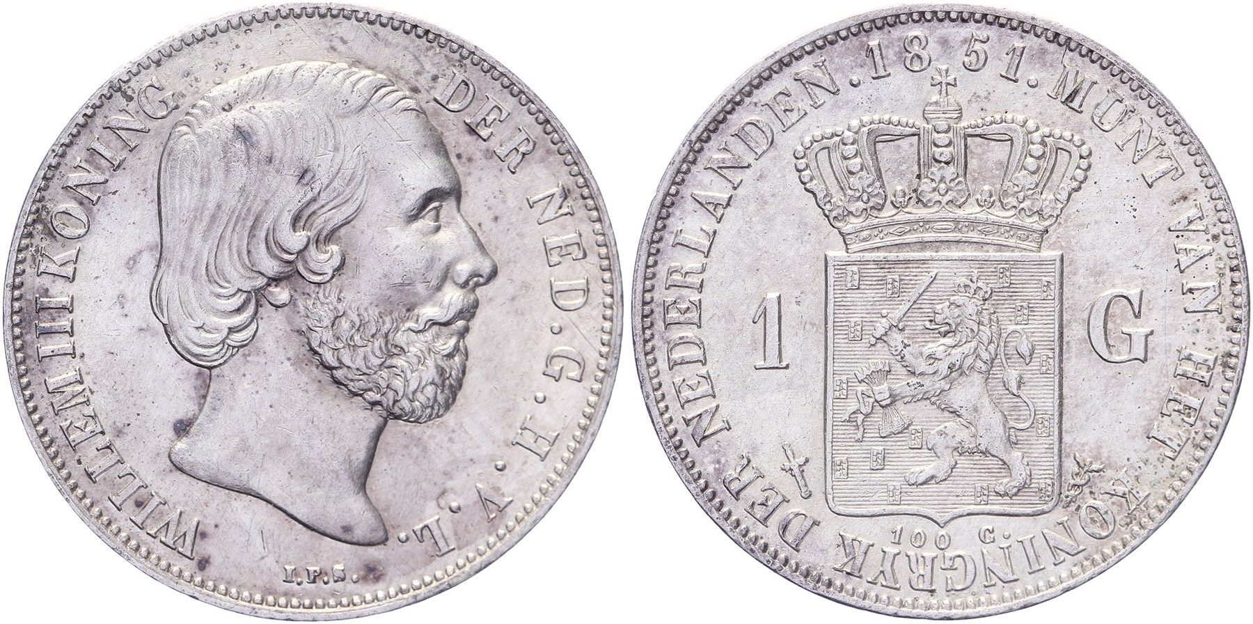 1 Gulden 1851 mmt. zwaard Sch. 605. Iets gespikkeld prachtig