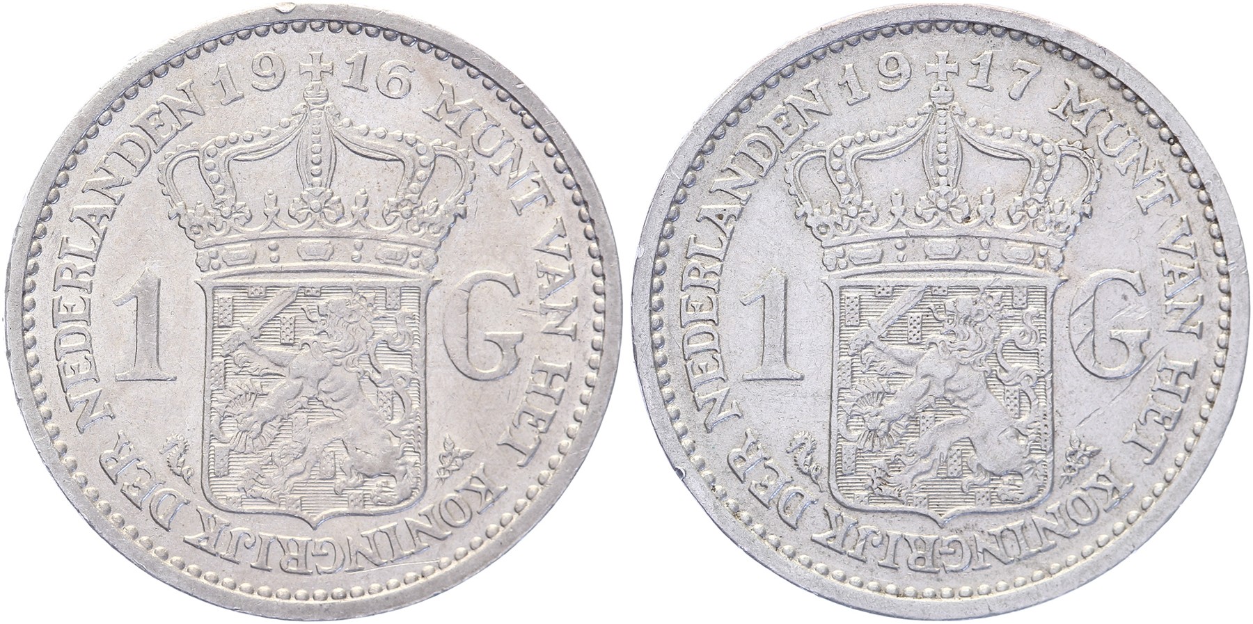Lot (2) 1 Gulden 1916 en 1917 Sch. 818 en 819 Zeer fraai / Prachtig