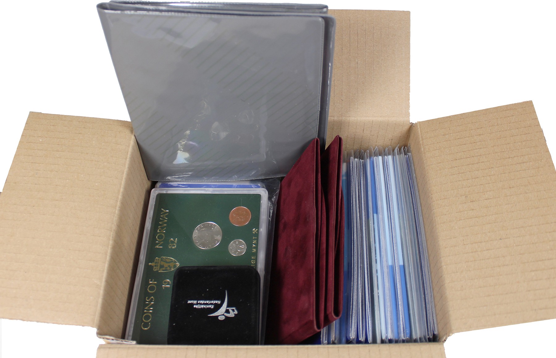 Doos met allerlei moderne uitgiften o.a. muntstrips 1973 en 1975, 18 x FDC-sets 1995-2002, 2 x proofset 2001, 3 x Beneluxset AR, 1 x gulden 2001 proof. Toegevoegd: diverse buitenlandse sets, ook zilver.