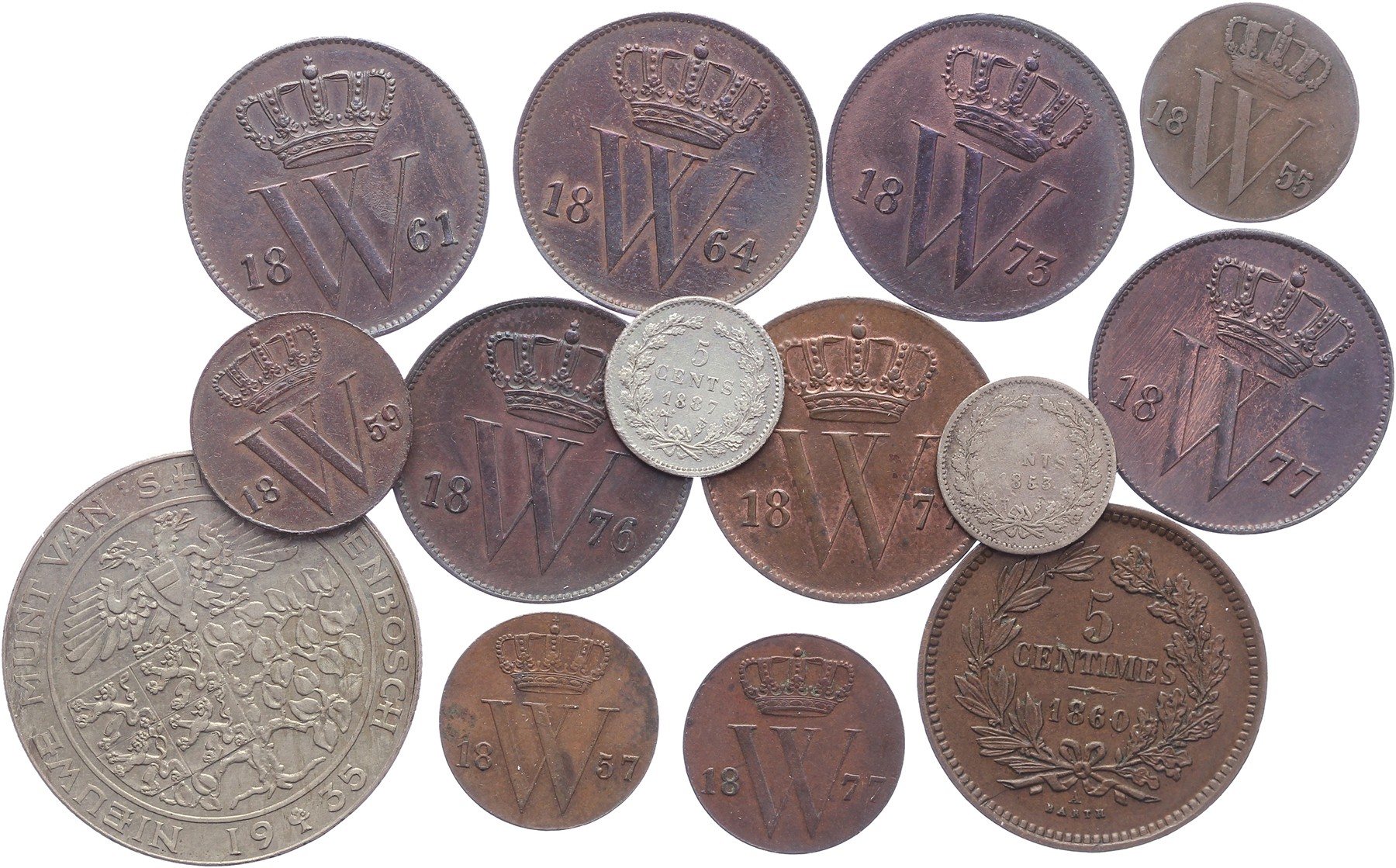 Doosje met leuk lot Willem III: 5 Cents 1853 en 1887; 1 Cent 1861, 1864, 1877, 1873, 1876 en 1877; ½ Cent 1857, 1859 en 1877. Toegevoegd: 5 Centimes 1860 Luxemburg en Zilveren Bossche Hendrik 1935. Zeer fraai en beter.