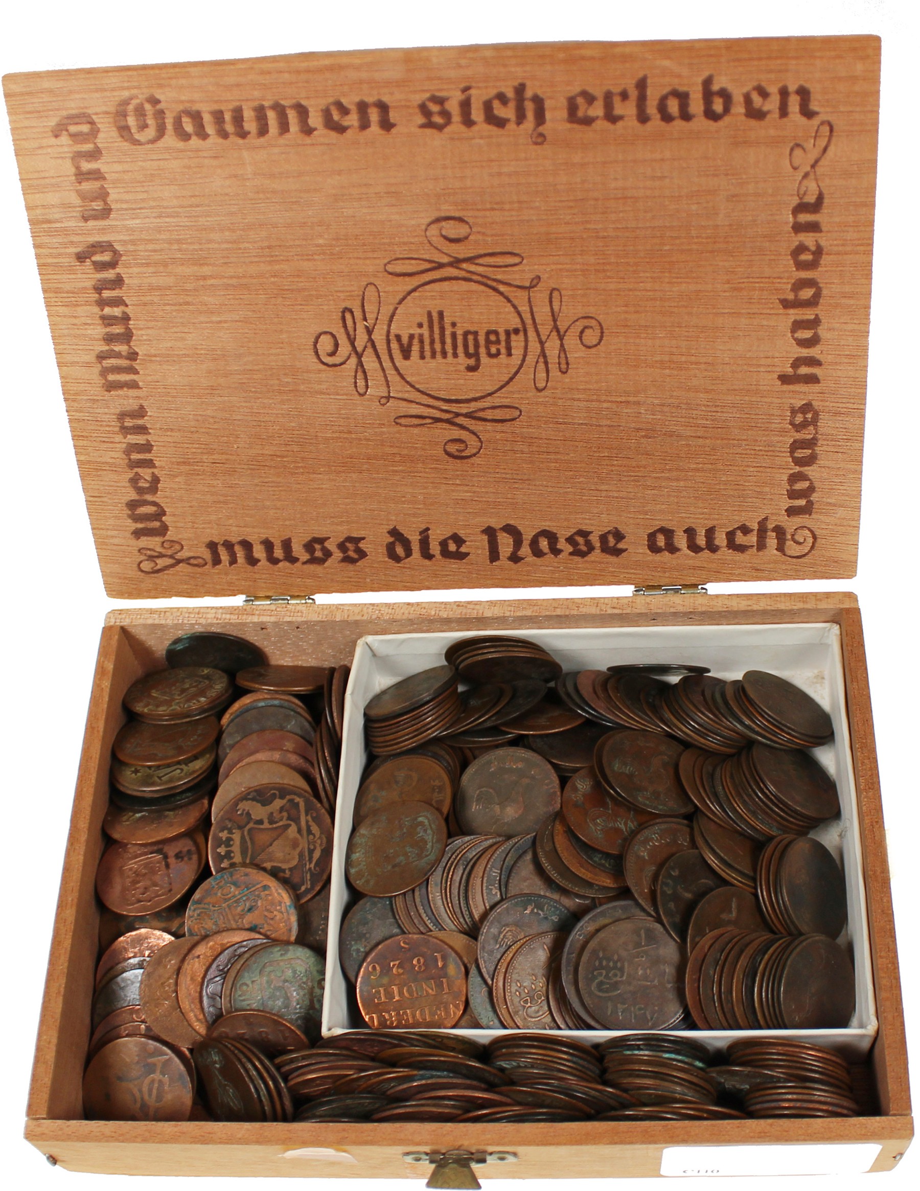 Kistje kopergeld N.O.I., vnl. VOC- en haantjesduiten, enige honderden. Onuitgezocht.