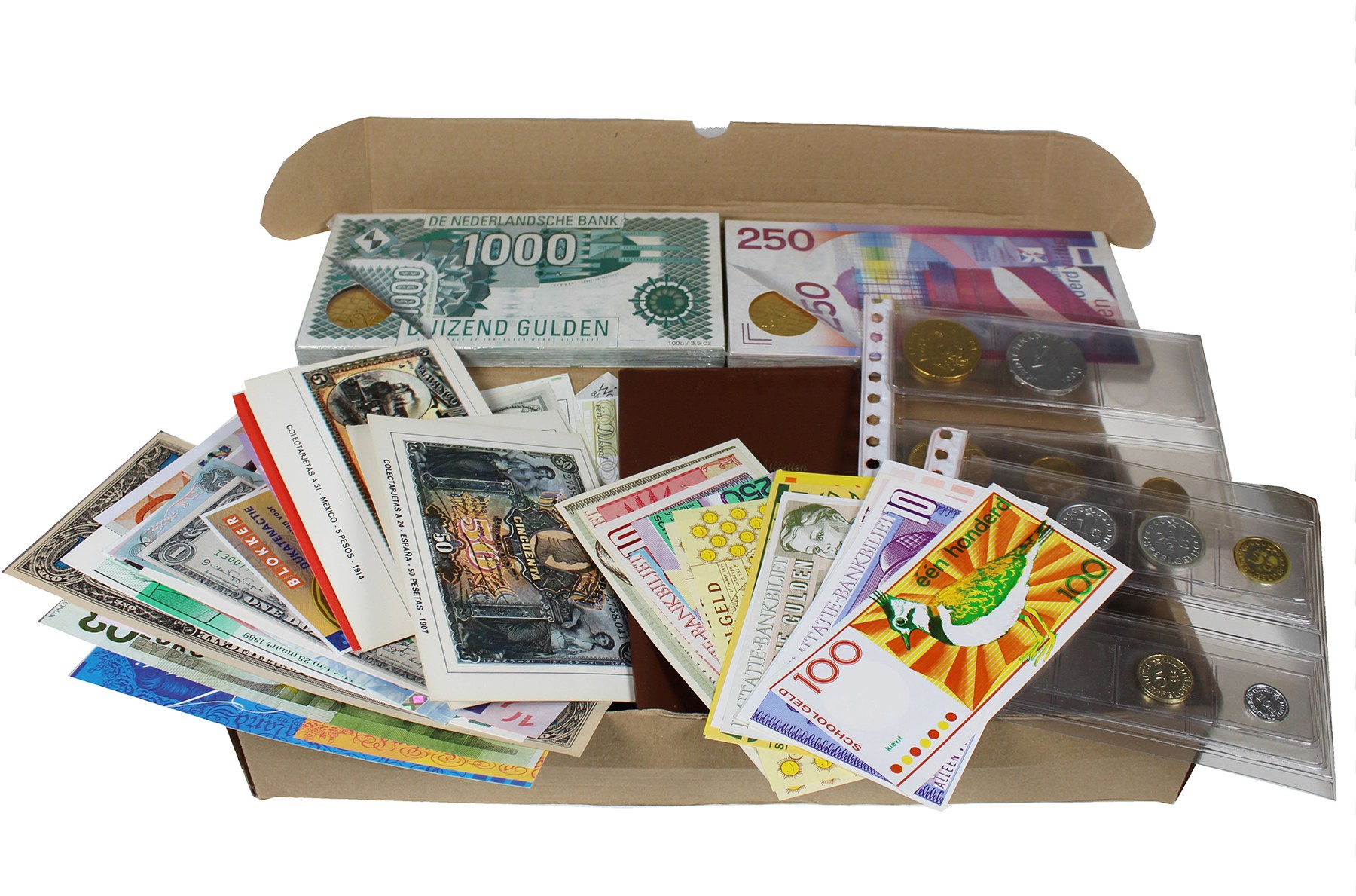 Doos met grote diversiteit reclamegeld uit verschillende landen, zowel pseudomunten en biljetten in veel vormen en maten. Ca. 150 stuks. Zeer divers!