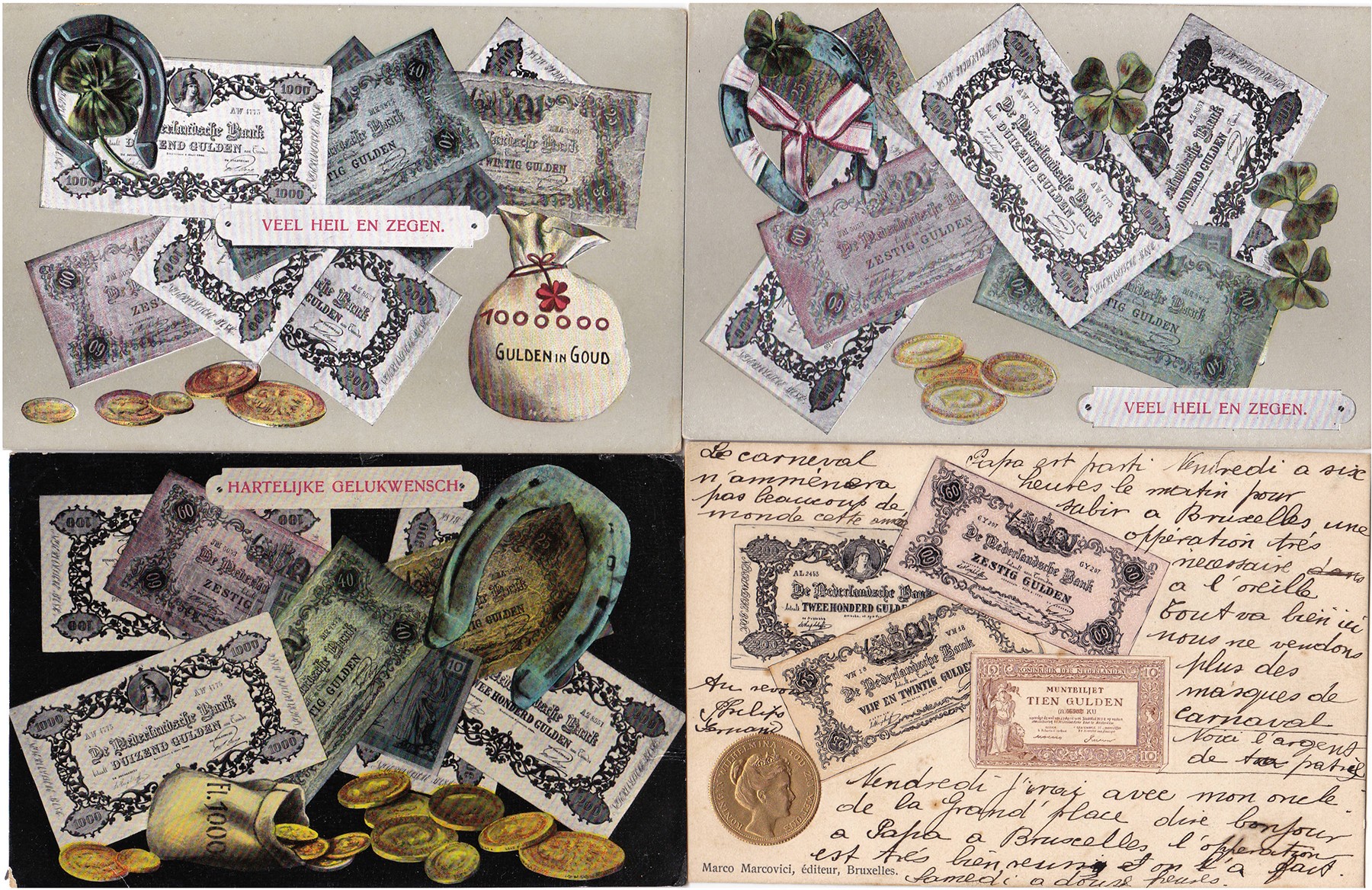 Lot (9) Oude ansichtkaarten met afbeeldingen van munten en bankbiljetten.