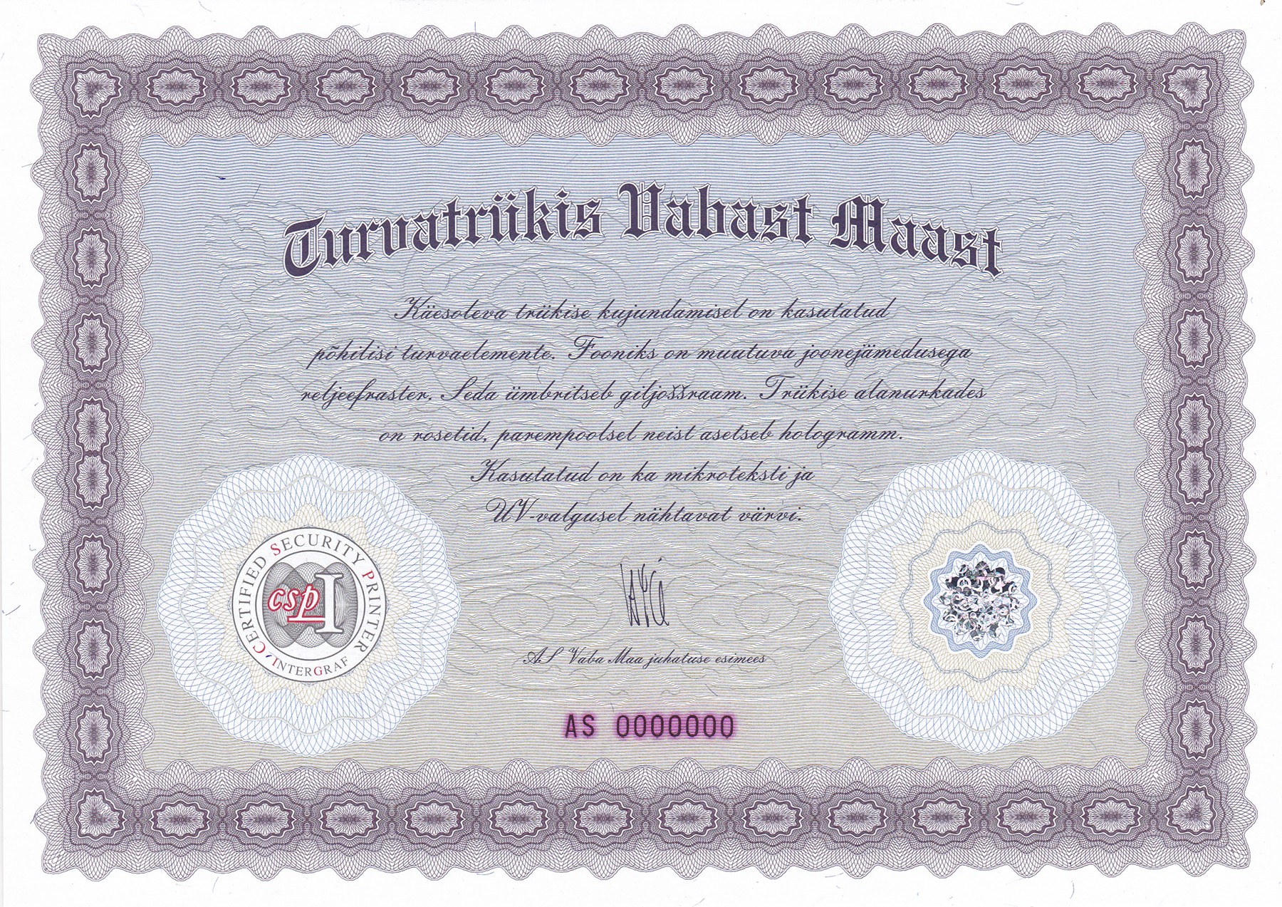 Trükikoda Printing Plant VABA MAA. A nice certificate with number [#AS 0000000]. UNC.