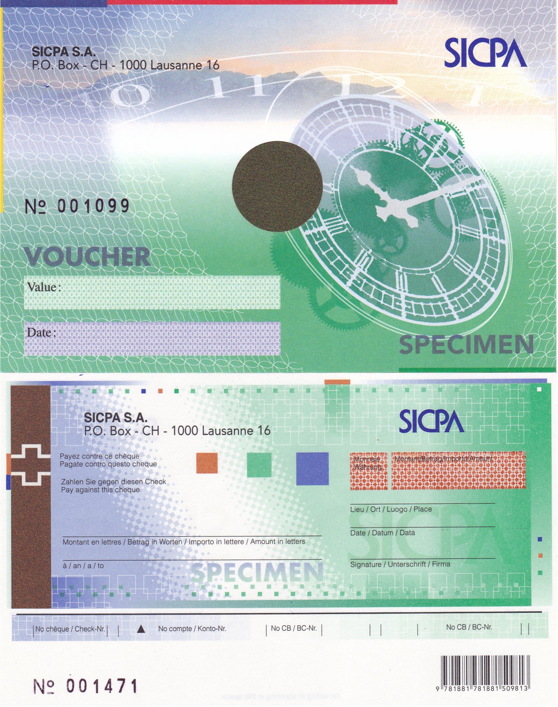 Lot (2) nice specimen. SICPA cheque and voucher security. With provenance / pedigree. UNC.