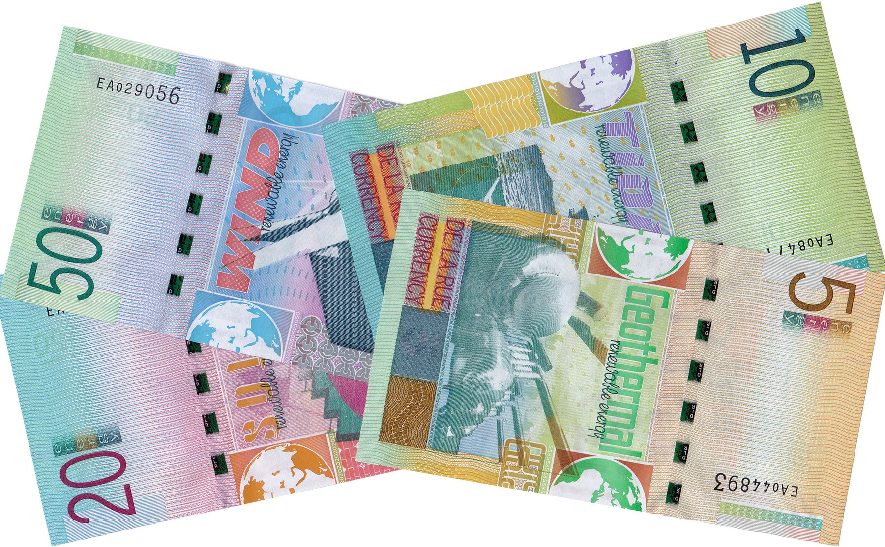 Lot (4) De La Rue Currency U.K. 2008. 5 Energy Geothermal ‘energy from the earth’; 10 Energy Tidal ‘energy from the sea’; 20 Energy Solar ‘energy from the sun’; 50 Energy Wind ‘energy from the air’. UNC with provenance / pedigree.
