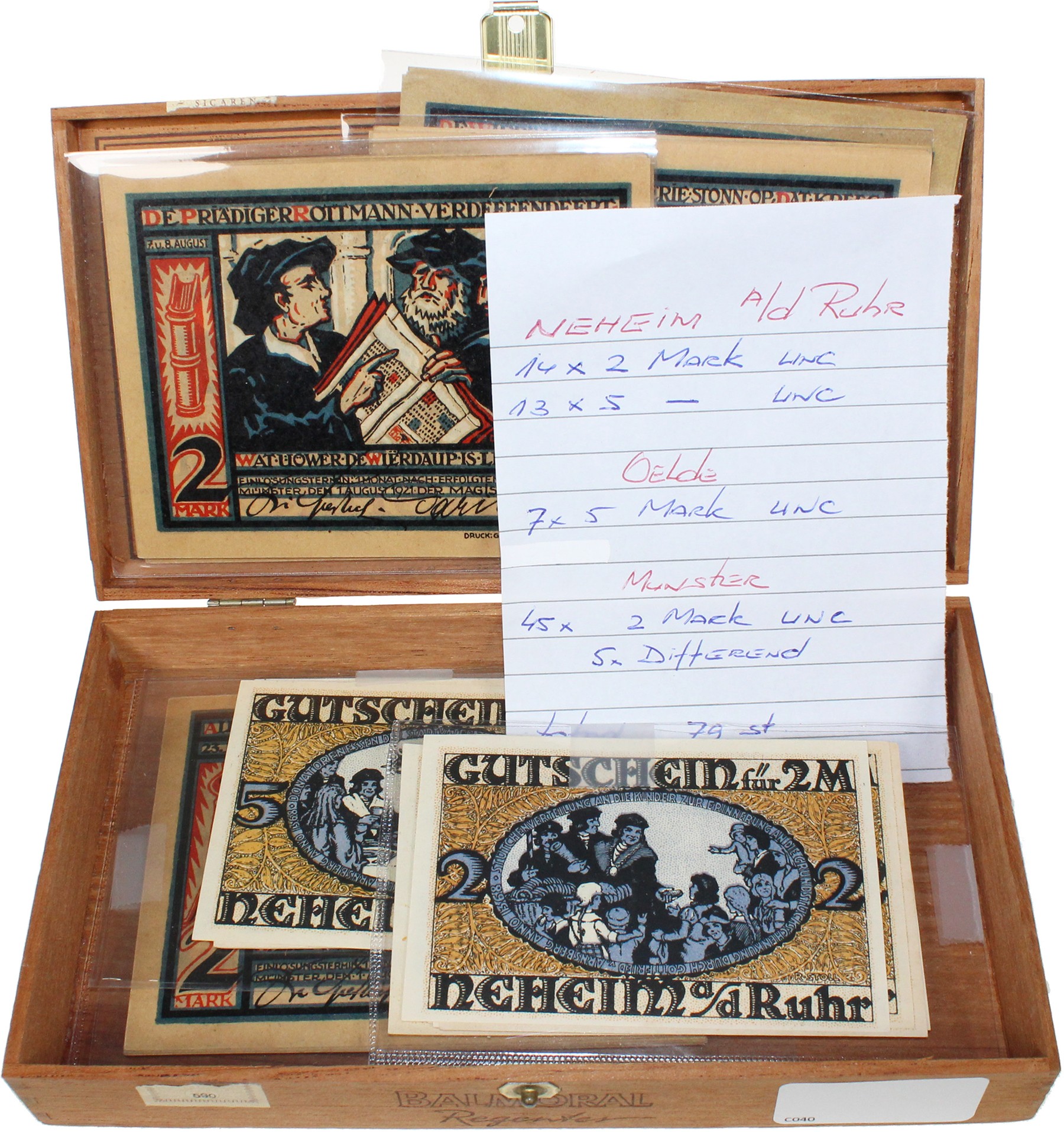Doosje met 79 noodgeldbiljetten van Duitsland.