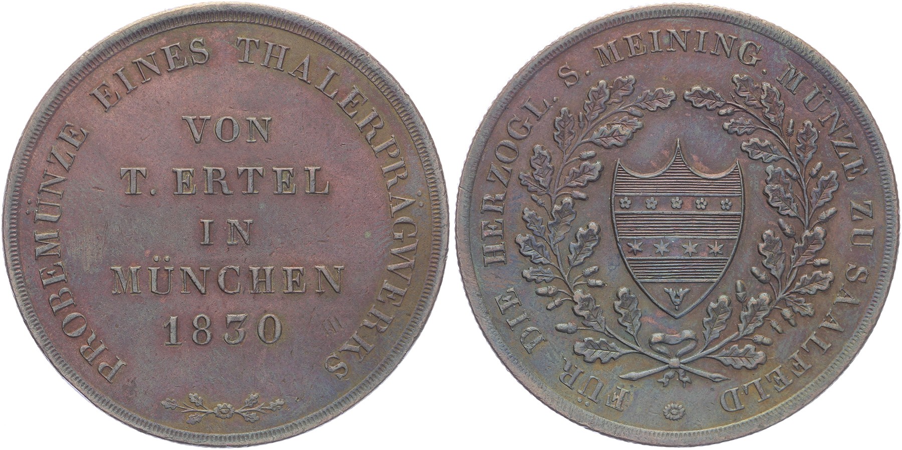 Kupfer Probetaler eines Talerprägewerkes 1830, von T. Ertel in München für die herzogliche Münze in Saalfeld. Hauser 862; Mers. 3457. Sehr schön / Vorzüglich.