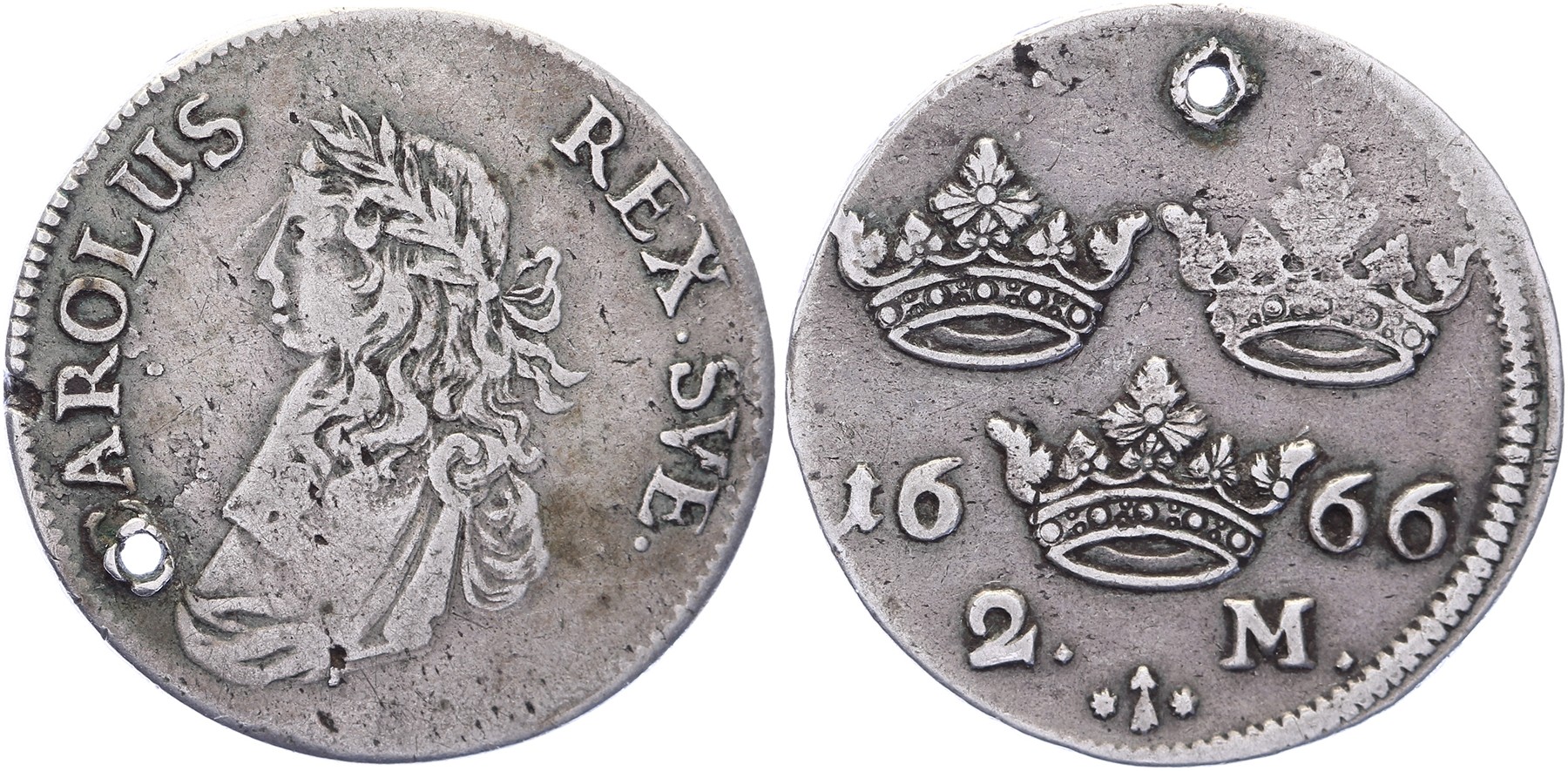 2 Mark 1666. KM 237a. Pierced. Fine.