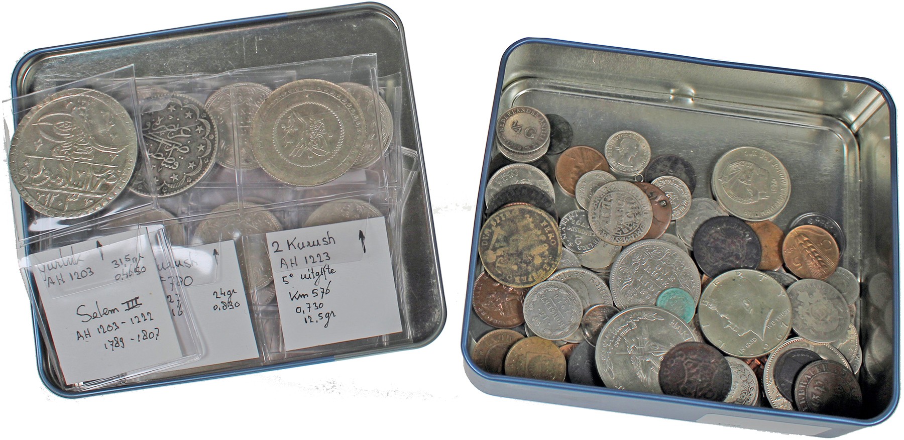 Blikje met onuitgezocht wereld o.a. India! Ook zilver.
