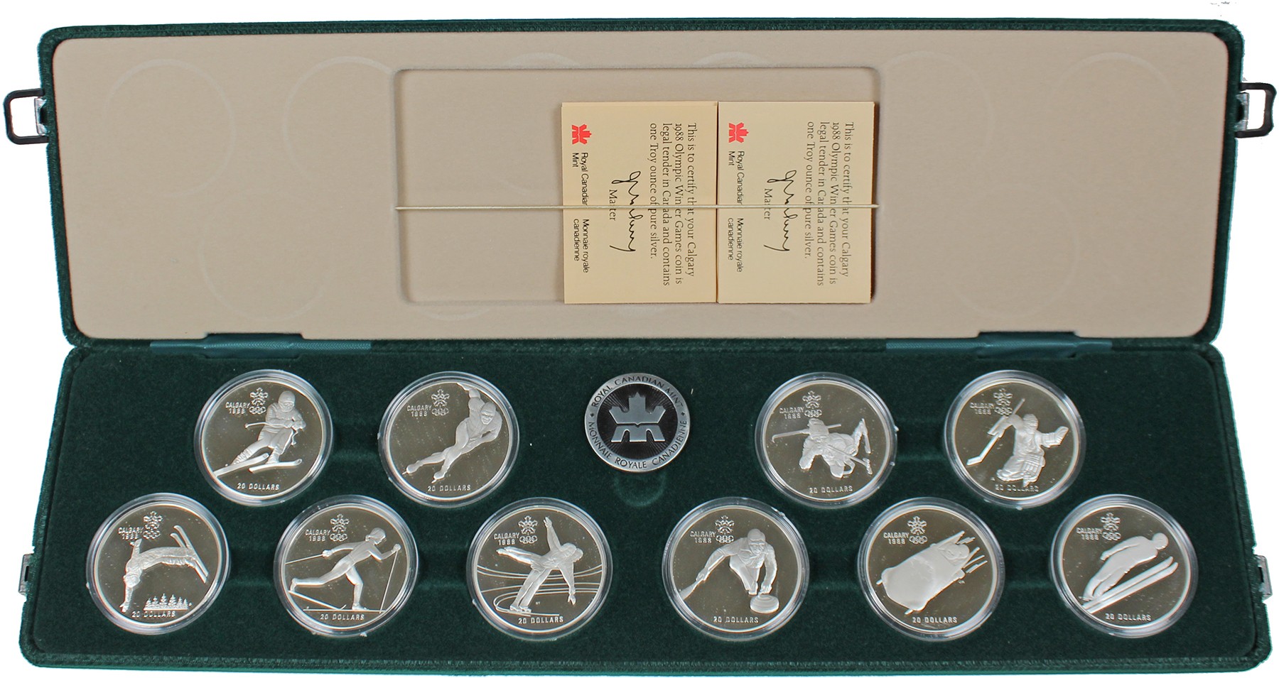 Canada, originele cassette met 10 x $ 20 zilver proof ‘Olympische Winterspelen Calgary 1988’. [ca. 311 gram netto zilver].