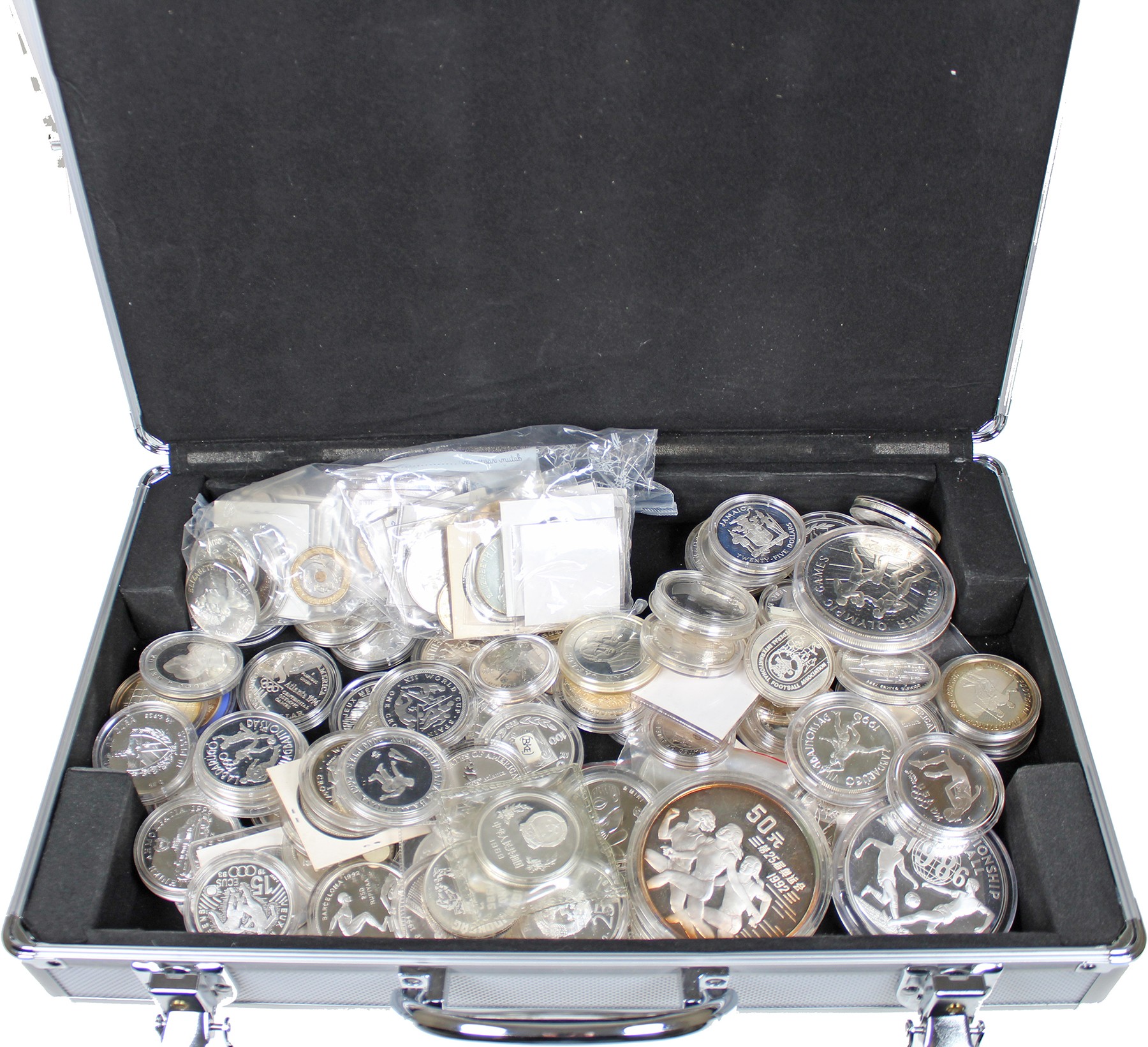 Zilverkleurig metalen koffer met ca. 2,5 kilo zilveren munten met als thema ‘sport’, veelal proof in capsule. Toegevoegd zakje met ‘sportmunten’ van onedel metaal. Moet gezien worden!