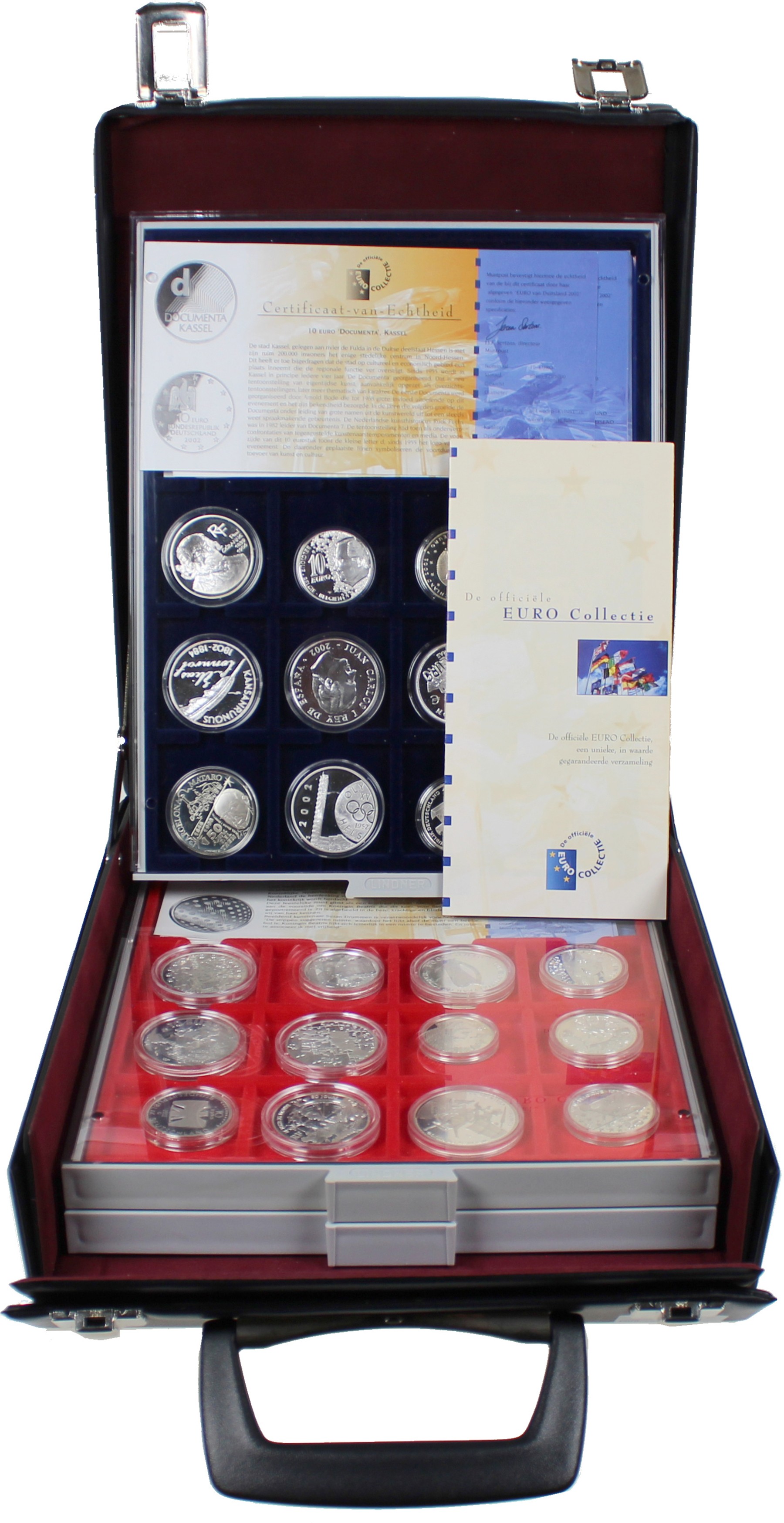 Zwart Lindner-koffertje met 3 laden, gevuld met voorlopers op de euro afkomstig uit verschillende landen, 37 stuks. Voornamelijk zilver en geslagen met gepolijste stempel.