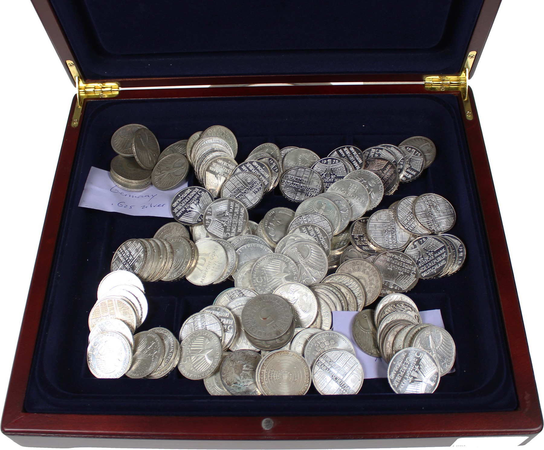 Kist met ruim 140 stuks zilveren 5 Mark Duitsland 1951-1973. Ca. 1540 gram 625/1000.