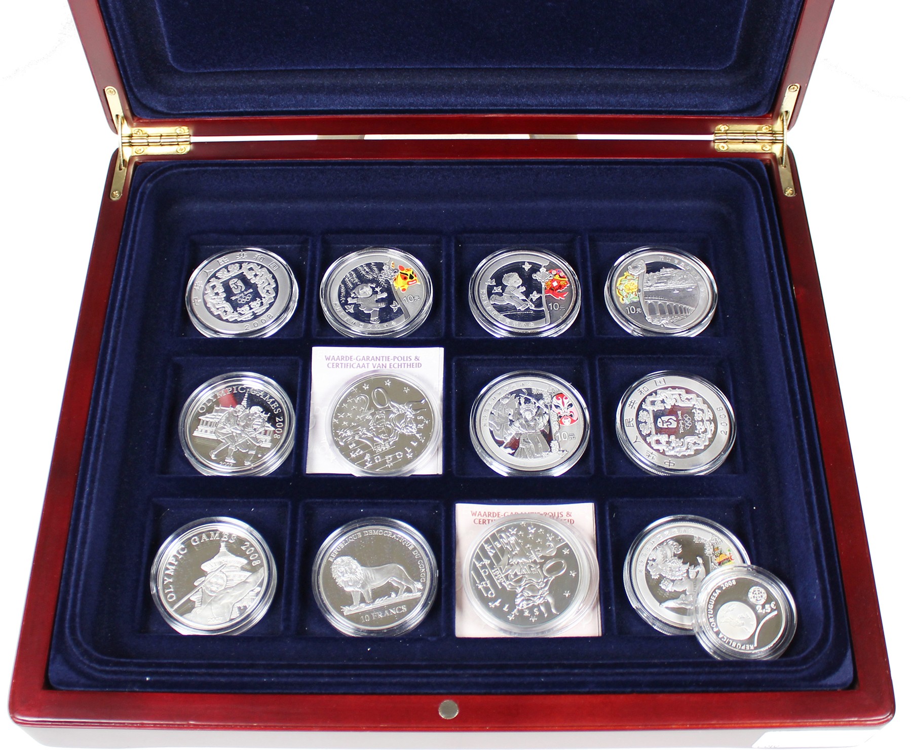 Kist met 14 zilveren herdenkingsmunten o.a. 6 x Yuan 2008 Olympic Games Beijng bi-colour.