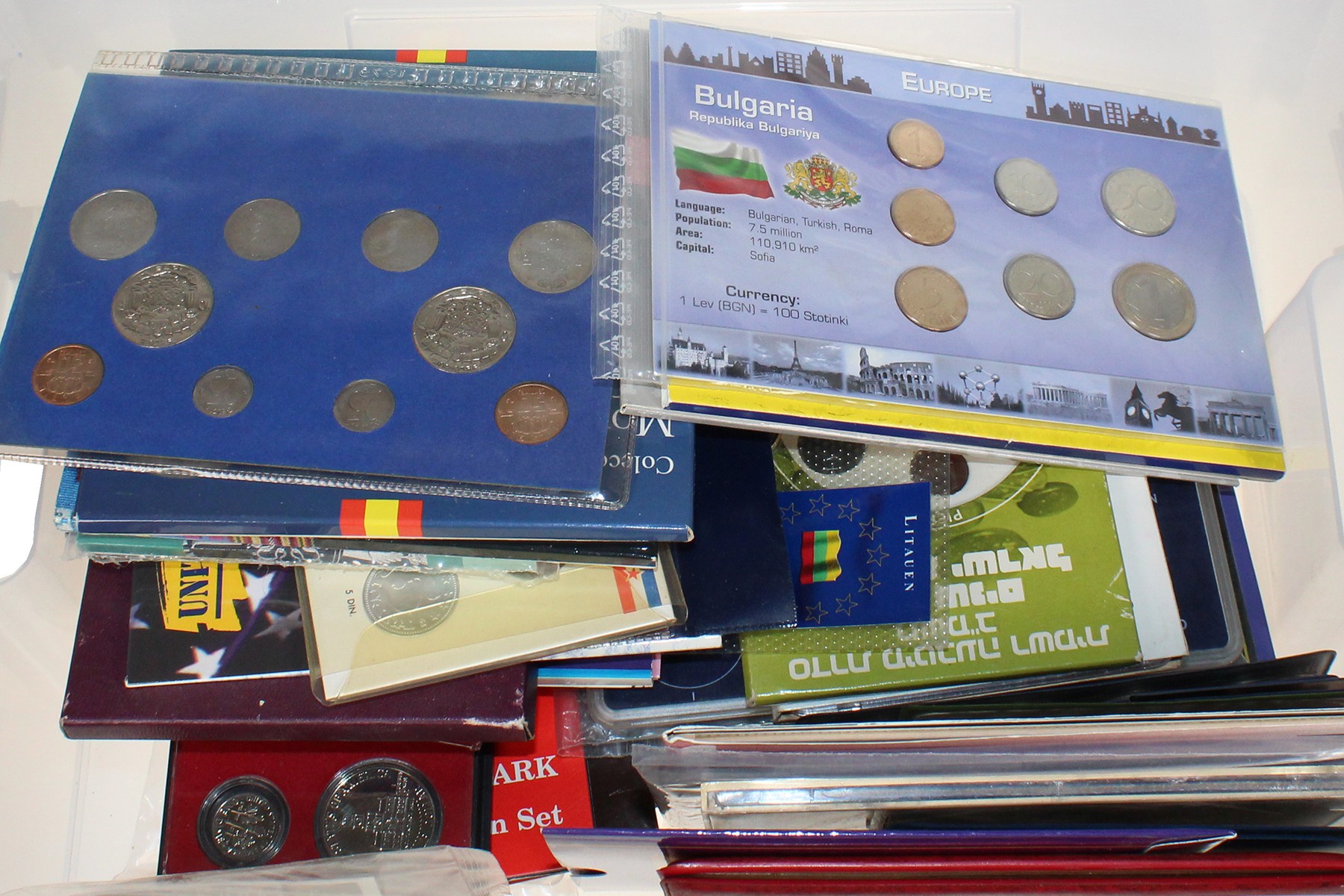 Plastic doos met ca. 45 muntsets van diverse landen.