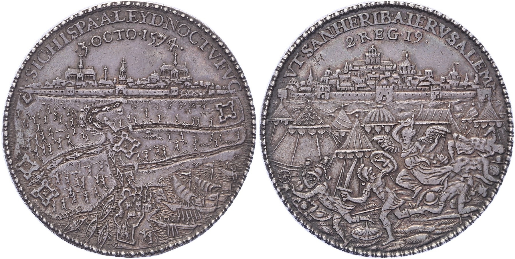 (1585) Ontzet van Leiden op de Spaanse troepen in 1574. Wegtrekken van de Spanjaarden uit het beleg rondom Leiden en aanzeilende vloot. Op de voorgrond de brandende schans van Zoetermeer met grote vlammen. Omschrift: SIC. HISPA. A. LEYD. NOCTV. FVG /. 3. OCTO 1574. / Soldaten in een legerkamp (volgens van Loon het leger van Sanherib, koning van Assyrië) vlucht voor een engel die hen met zwaard te lijf gaat. Omschrift: VT. SANHERIB. A. IERVSALEM / 2. REG. 19.AR 47 [33,9 gram]. vL I-195. G. van Bylaer. Mooi patina. Prachtig. - Aangekocht bij Künker, maart 2014, veiling 247, kavel 5414.