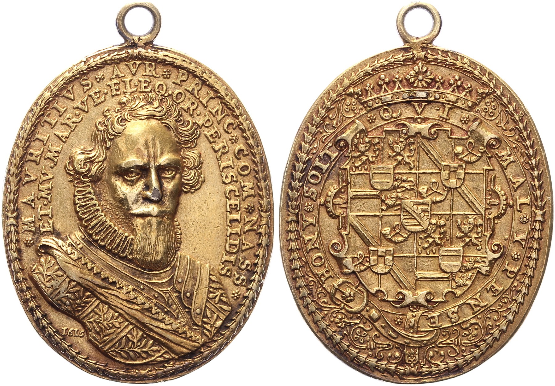 1615 Prins Maurits van Oranje-Nassau. Geharnast borstbeeld van voren met tweeregelig omschrift: * MAVRITIVS * AVR * PRINC * COM * NASS* ET. MV. MAR. VE. FL. EQ. OR. PERISCELIDIS; Het geheel binnen een bladerkrans. / Gekroond prinselijk cartouchevormig wapenschild met de orde van de Kousenband met motto: * HONY * SOIT * QVI * MAL * Y * PENSE. AR verguld 54 x 44 [39,65 gram]. vL II-87; JMP 1955 pl. 6.2. (A. Rottermont). Met draagoog. Zeldzaam. Prachtig. - Aangekocht bij Munthandel Verschoor, december 2011.