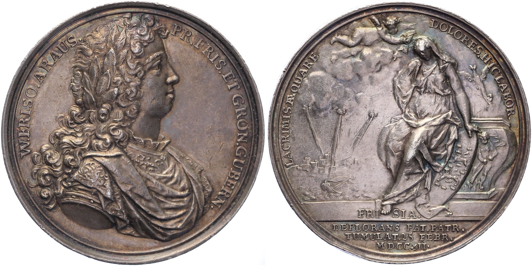1712 Willem Friso, prins van Oranje en Stadhouder van Friesland en Groningen, begraven te Leeuwarden. Gelauwerd borstbeeld naar rechts. / Friesland treurt met op de achtergrond het zinkende schip waarin de prins zat. AR 50 [55,4 gram]. vL IV-613. Randoneffenheden. Uiterst zeldzaam (RRR). Zeer fraai +. - Aangekocht bij Laurens Schulman BV, april 1994, veiling 12, kavel 955. Uit veiling J. Schulman ‘Prinses Marianne’. November 1933, nr. 513.