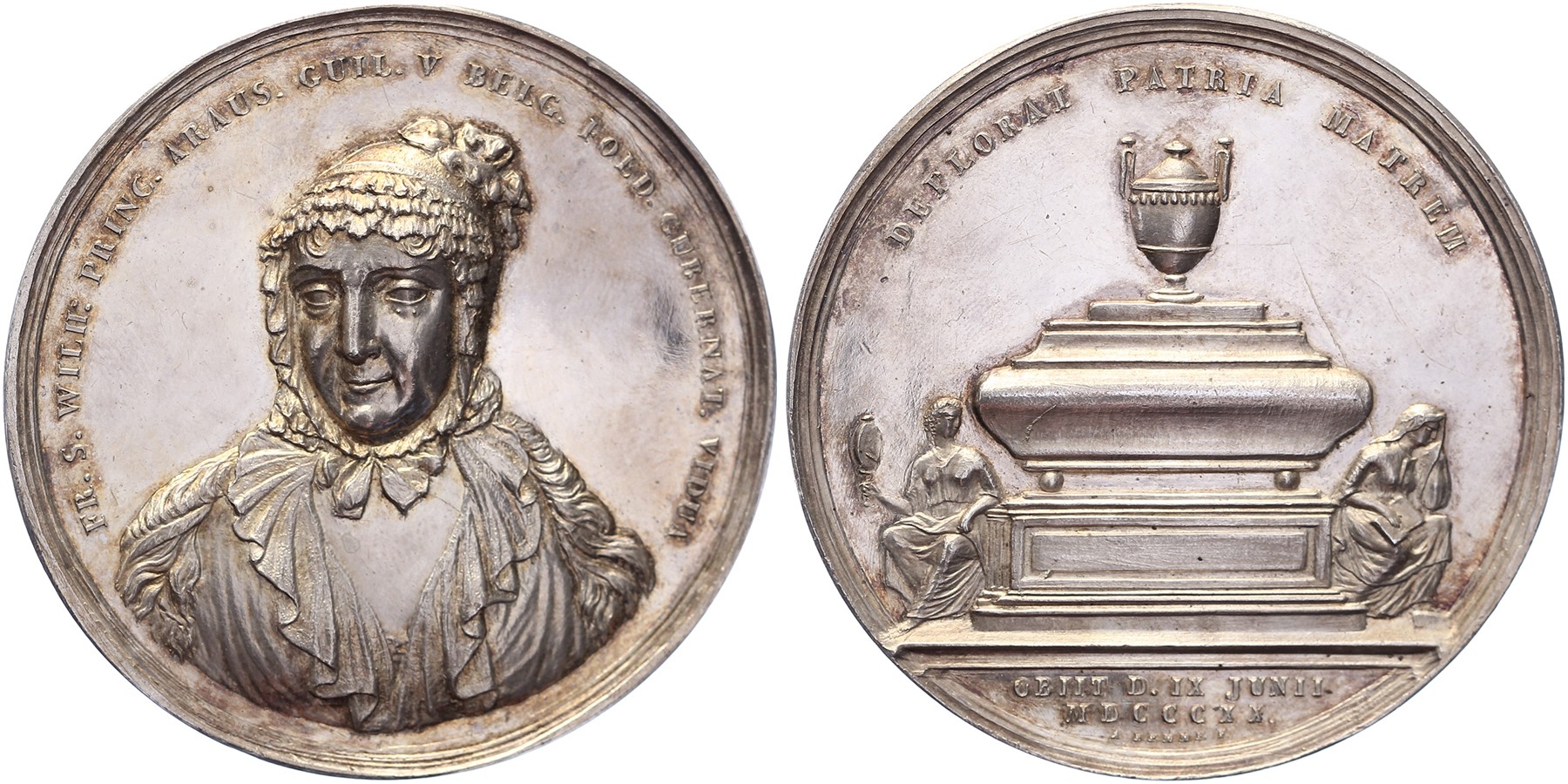 1820 Overlijden prinses Wilhelmina van Pruisen. Weduwe van Willem V. Borstbeeld van de prinses en face en naar links gewend. Omschrift: FR. S. WILM: PRINC. ARAUS. GUIL. V BELG. FOED. GUBERNAT. VIDUA. / Grafmonument waarop een urn is geplaatst met aan weerszijden twee vrouwen. Omschrift: DEPLORAT PATRIA MATREM. AR 57 [65,43 gram]. Dirks 163; Oranjepenningen 1129. A. Bemme. Zeer fraai / Prachtig. - Aangekocht bij Munthandel Verschoor, augustus 2007.