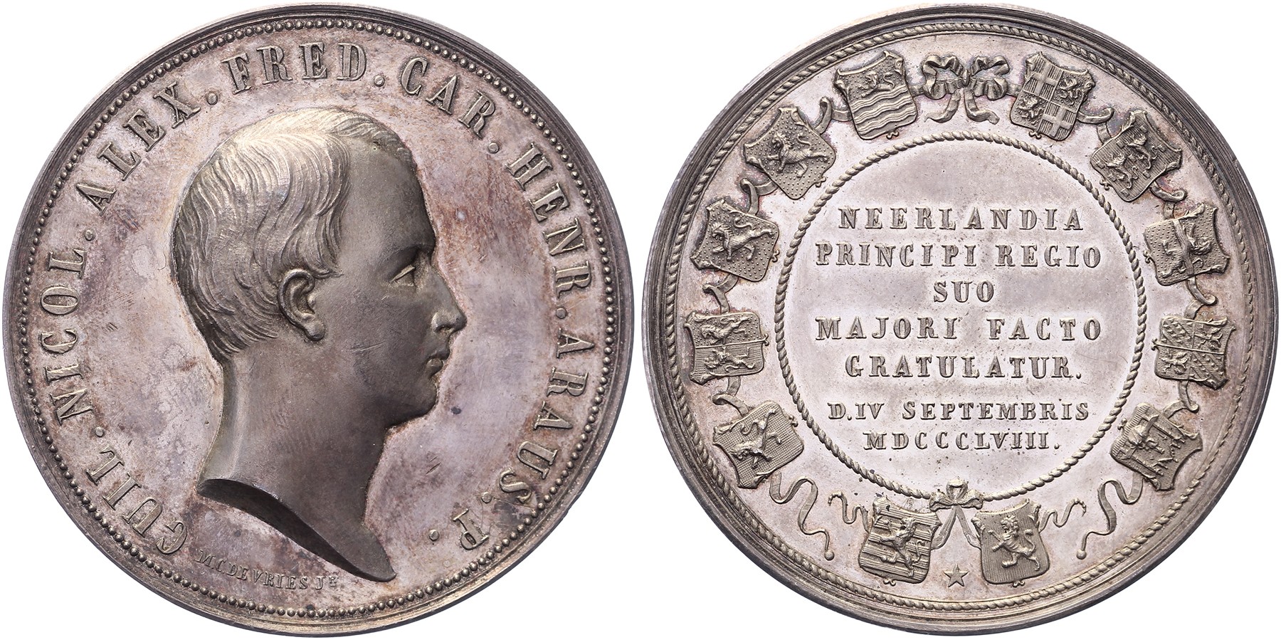 1858 Kroonprins Willem Nicolaas van Oranje meerderjarig. Hoofd van de prins naar rechts. / Zevenregelige tekst binnen cirkel van 12 wapenschilden door lint verbonden. AR 62 [104,91 gram]. Dirks 810. M.C. de Vries jr. Zeldzaam (RR). Prachtig. - Aangekocht bij Laurens Schulman BV, november 1994, veiling 13, kavel 1573.