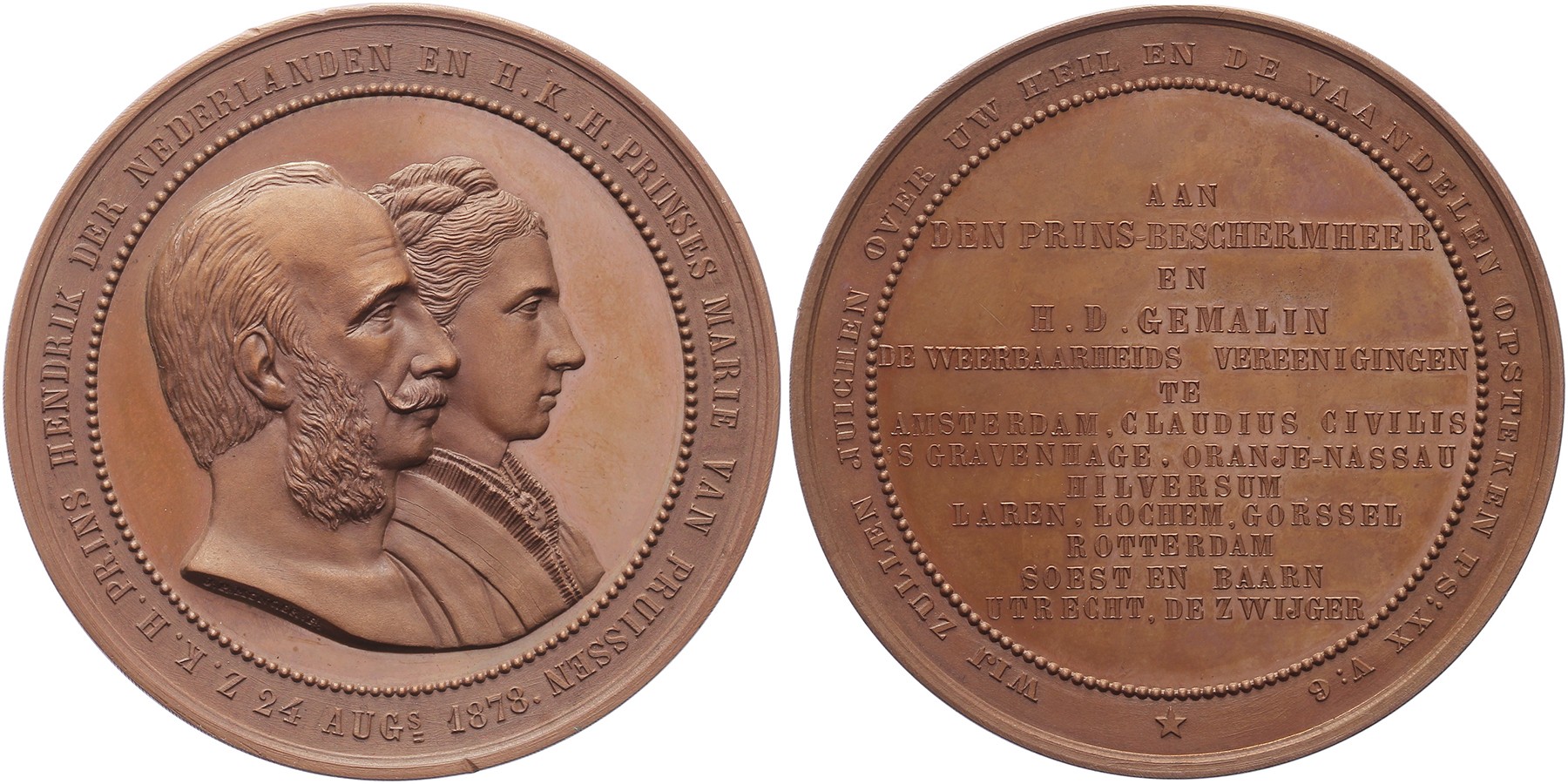 1878 Huwelijk van Prins Hendrik der Nederlanden en Prinses Maria van Pruissen. Naar rechtsgewend dubbelportret van het echtpaar. Omschrift: Z.K.H. PRINS HENDRIK DER NEDERLANDEN EN H.K.H. PRINSES MARIE VAN PRUISSEN - 24 AUGs. 1878. / Dertienregelige tekst. Omschrift: wij zullen juichen over uw heil en de vaandelen opsteken. Æ 63 mm. Zw. 449. J.P. Menger. FDC. - Aangekocht bij Laurens Schulman veiling 12, april 1994, kavel 1005.