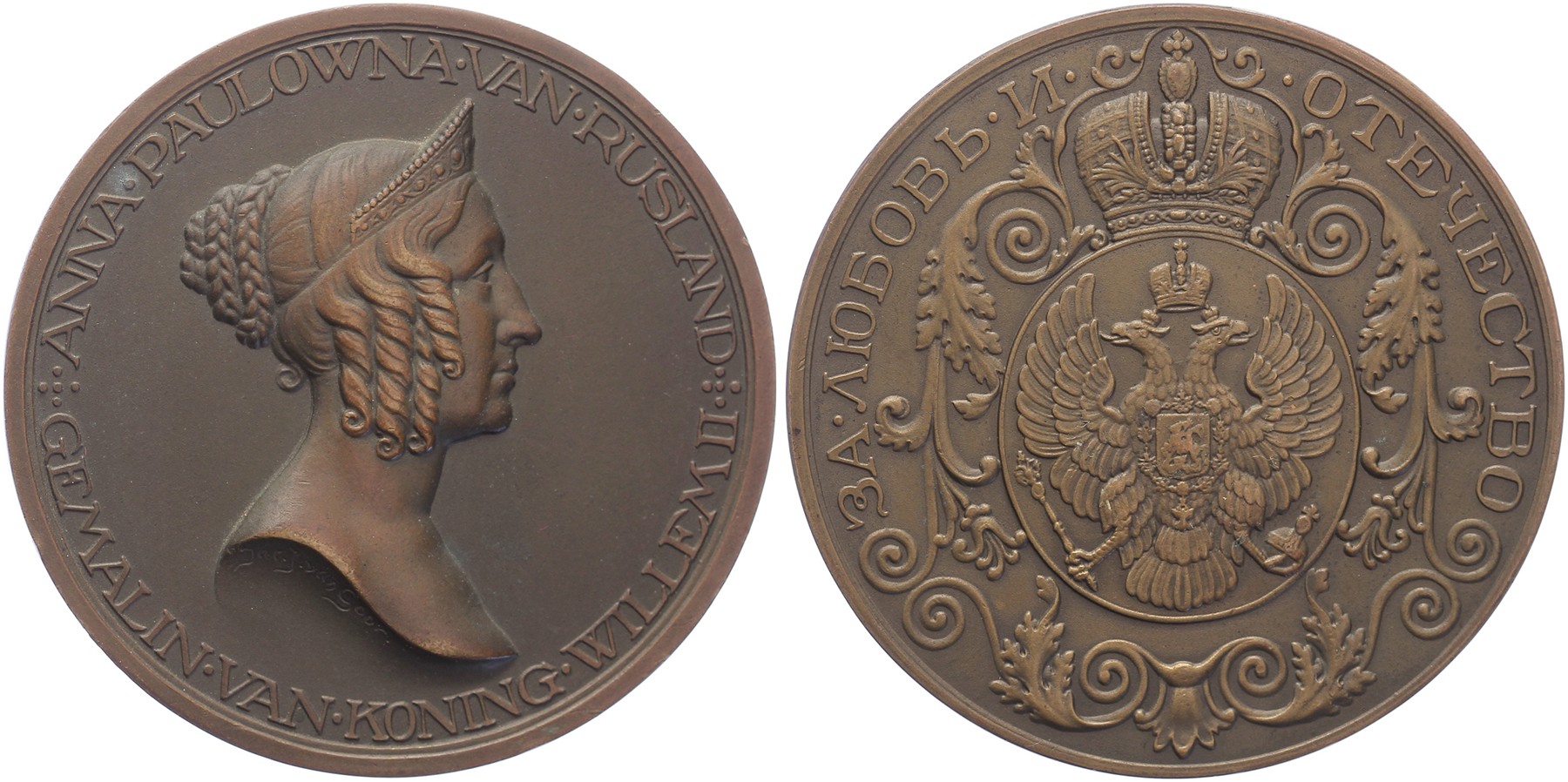 1930 50e verjaardag H.M. Koningin Wilhelmina. Rechts gewend hoofd, omschrift: ANNA. PAULOWNA. VAN. RUSLAND – GEMALIN. VAN . KONING. WILLEM II. / Om het wapen (in Russische letters): ЗА АЮБОВБ И ОТЕЧЕСТВО. Æ 60. KB III-421. J.J. van Goor. Prachtig. - Aangekocht bij Van der Dussen, veiling 22, kavel 1682.