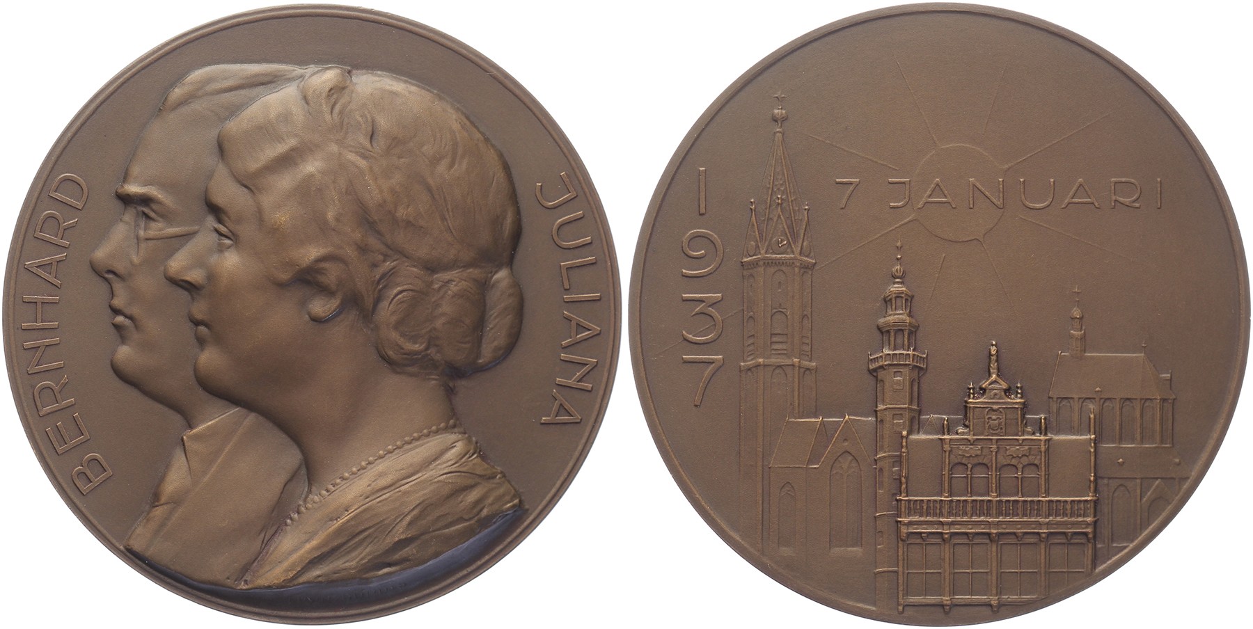 1937 Huwelijk prinses Juliana met prins Bernhard van Lippe-Biesterfeld 7 januari. Borstbeelden Juliana en Bernhard naar links. / Het oude stadhuis van Den Haag, waarin het burgerlijk huwelijk werd voltrokken, daarachter de Grote Kerk waarin het kerkelijk huwelijk werd voltrokken.Æ 65. KB V-1073; Toon Dupuis & (J.J. van Goor). Prachtig.