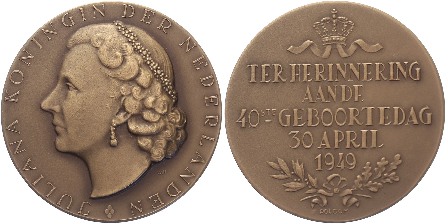 1949 40e verjaardag van H.M. Koningin Juliana. Borstbeeld van koningin Juliana naar links. / Koningskroon met lint met daaronder vijfregelige tekst. Æ 50. KB V-1961 (voorzijde uit 1951) en KB V-1831 (keerzijde uit 1949). Wim van Hoorn & Pol Dom. Prachtig.
