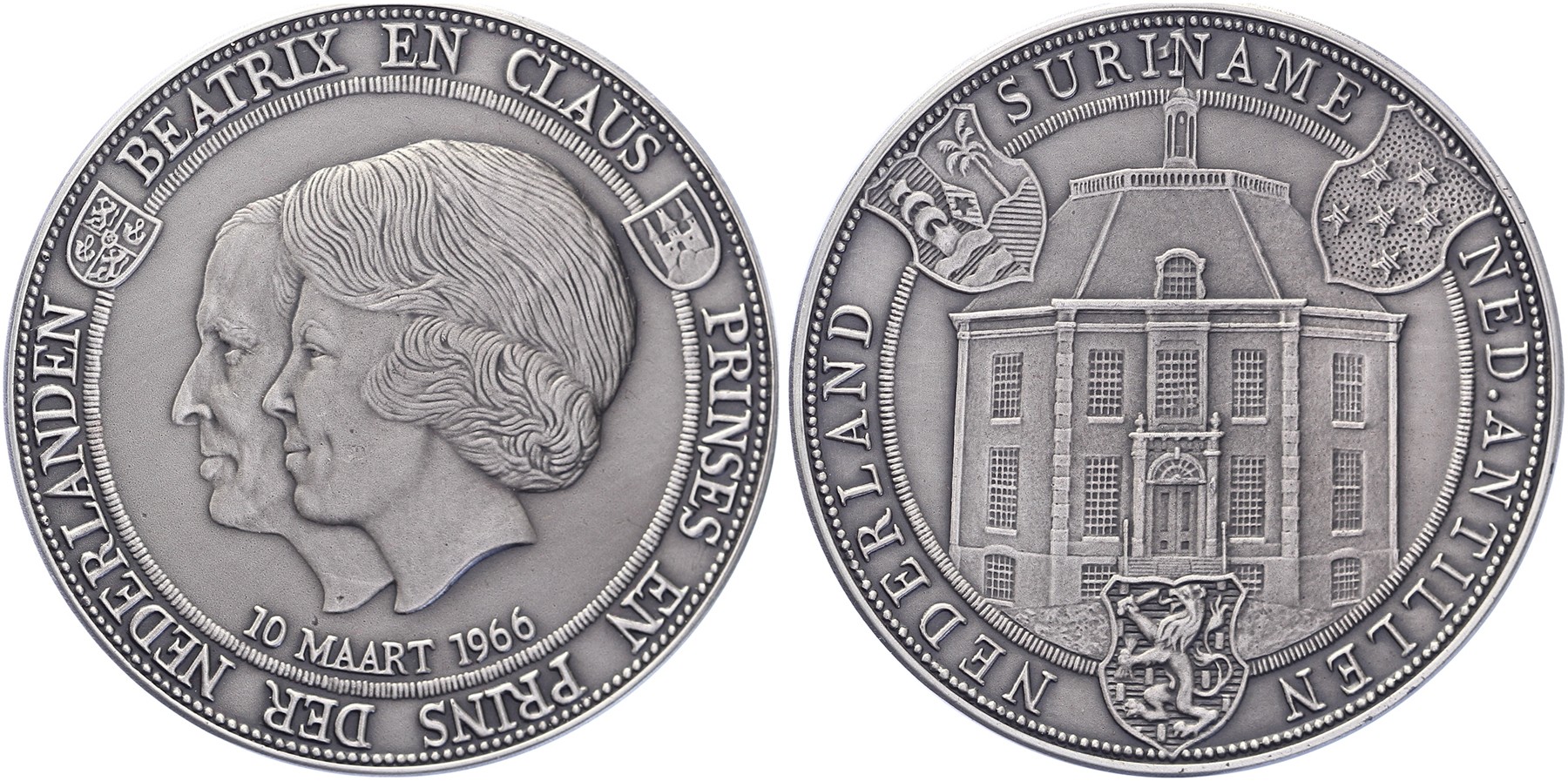 1966 Huwelijk van prinses Beatrix en Claus von Amsberg. Dubbelportret naar links, en de twee wapens van het paar. Met randschrift BEATRIX EN CLAUS PRINSES EN PRINS DER NEDERLANDEN / 10 MAART 1966. / Kasteel Drakesteyn met randschrift NEDERLAND - SURINAME - NED. ANTILLEN, daartussen de wapens der rijksdelen. AR of verzilverd 50. KB VI-3182. J. Hekman. Prachtig. - Aangekocht bij Karel de Geus Muntveilingen ,veiling 6, kavel 848.